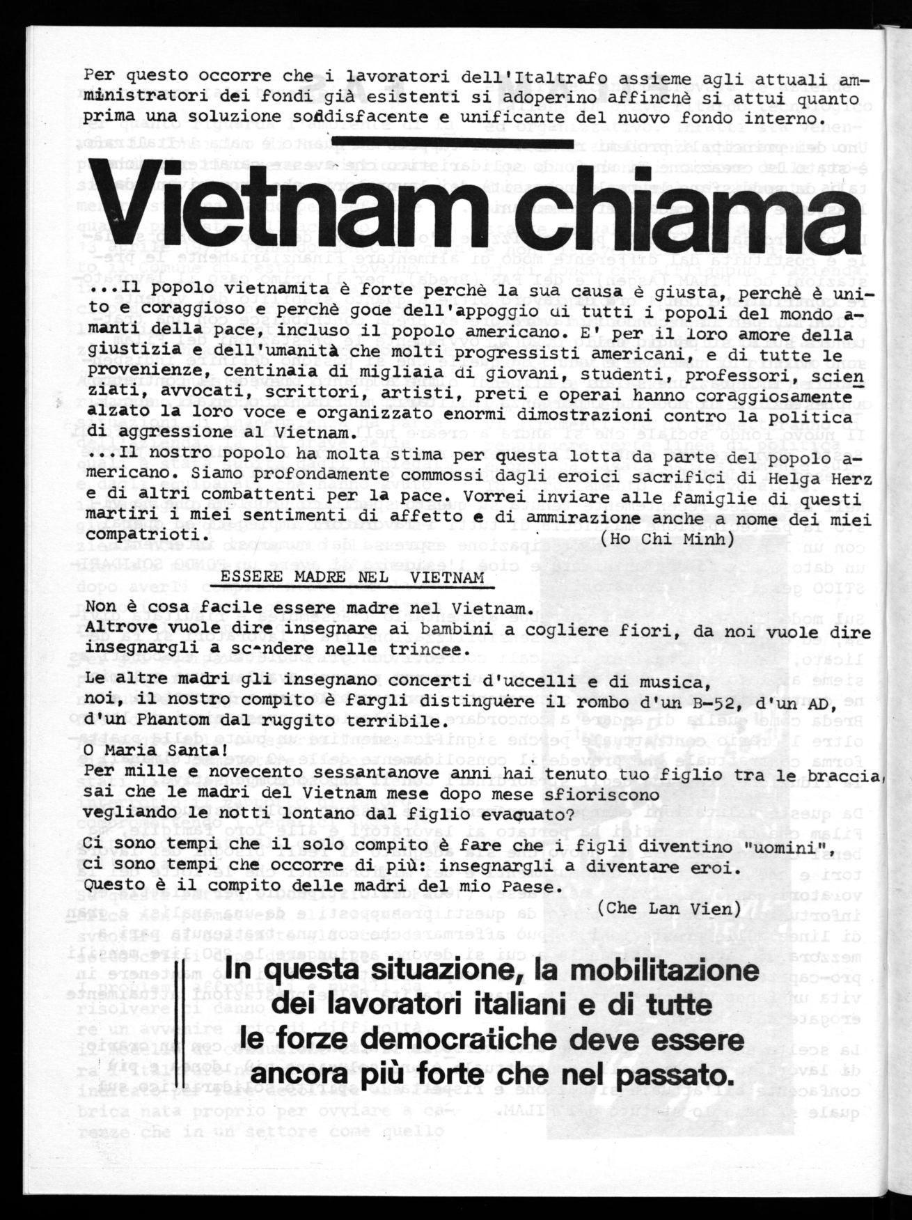 ...Il popolo vietnamita è forte perchè la sua causa è giusta, perchè è unito e coraggioso e perchè gode dell'appoggio ui tutti i popoli del mondo amanti della pace, incluso il popolo americano. E' per il loro amore della giustizia e dell'umanità che molti progressisti americani, e di tutte le provenienze, centinaia di migliaia di giovani, studenti, professori, scien ziati, avvocati, scrittori, artisti, preti e operai hanno coraggiosamente alzato la loro voce e organizzato enormi dimostrazioni contro la politica di aggressione al Vietnam.