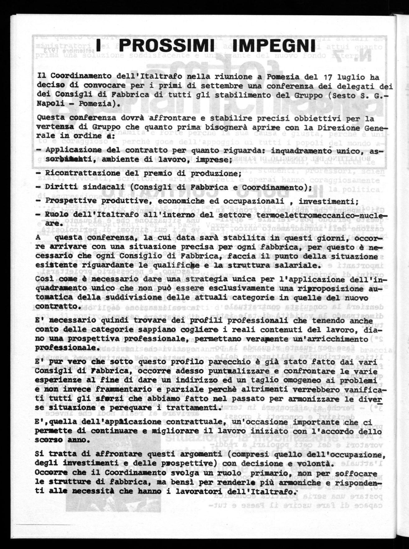 Il Coordinamento dell'Italtrafo nella riunione a Pomezia del 17 luglio ha deciso di convocare per i primi di settembre una conferenza dei delegati dei dei Consigli di Fabbrica di tutti gli stabilimento del Gruppo (Sesto S. G.Napoli - Pomezia).