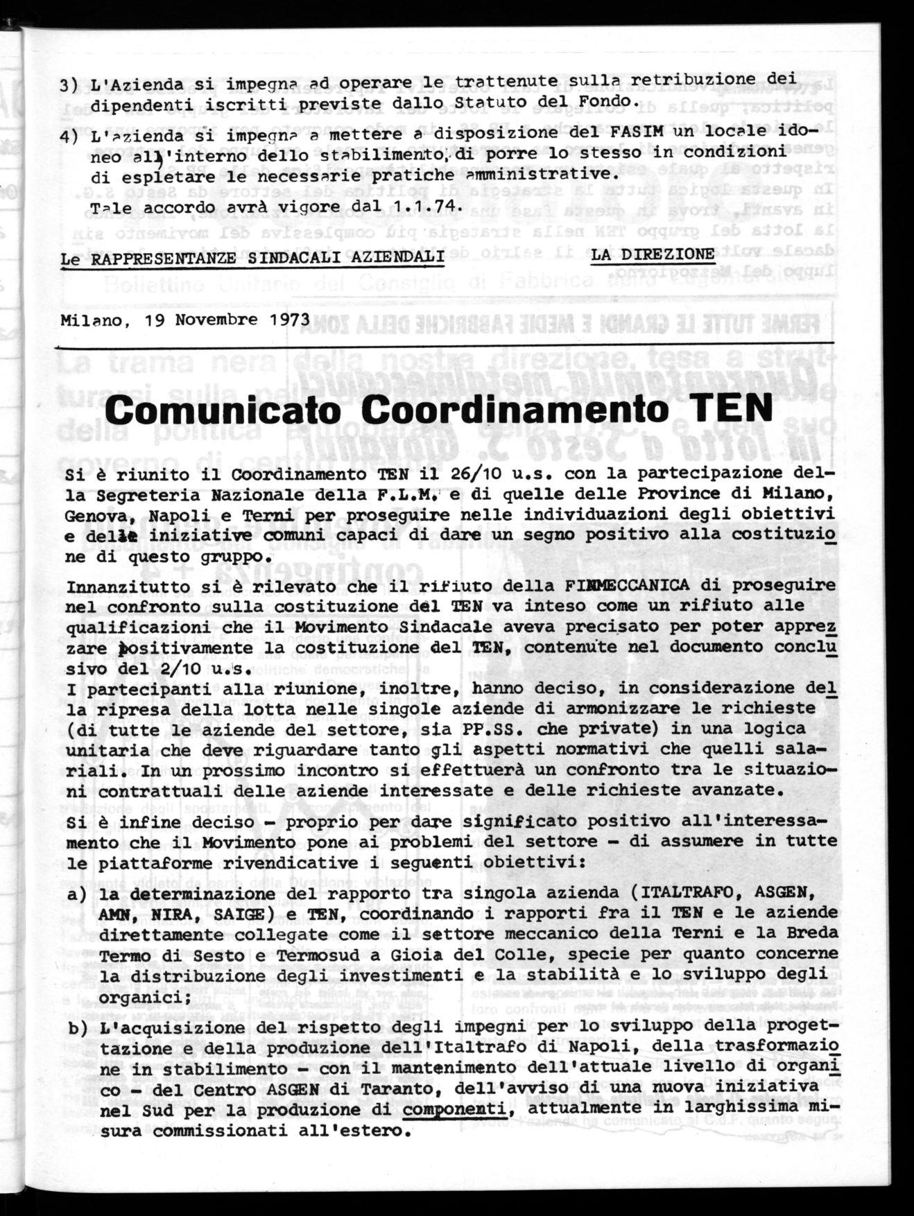 La cémune rivendicazione,di tali obiettivi rappresenta una precisa scelta politica; quella di collegare le lotte dei lavoratori del gruppo TEN e del le aziende elettromeccaniche a PP.SS. in modo concreto per imporre una orno_ genea condizione di lavoro ma soprattutto un reale sviluppo del settore, rispetto al quale esiste una responsabilità specifica delle PP.SS. In questa logica tutta la strategia di politica del settore da Sesto S.G. in avanti, trova in questa fase una puntuale concretizzazione, inserendo la lotta del gruppo TEN nella strategia più complessiva del movimento sin dacale volta a garantire il salrio dell'attacco inflazionistico e lo sviluppo del Mezzogiorno.