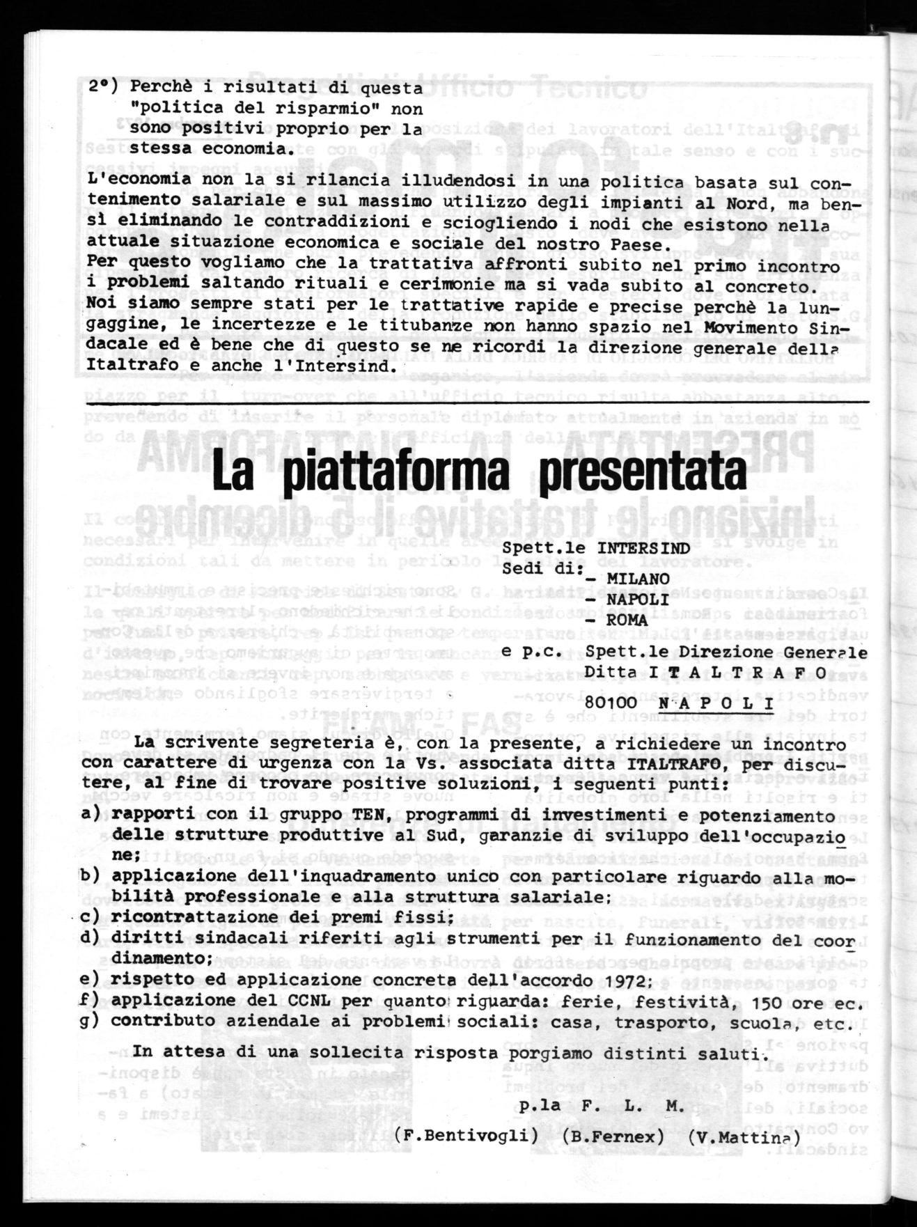 Per questo vogliamo che la trattativa affronti subito nel primo incontro i problemi saltando rituali e cerimonie ma si vada subito al concreto. Noi siamo sempre stati per le trattative rapide e precise perchè la lungaggine, le incertezze e le titubanze non hanno spazio nel Movimento Sindacale ed è bene che di questo se ne ricordi la direzione generale dellp Italtrafo e anche l'Intersind.