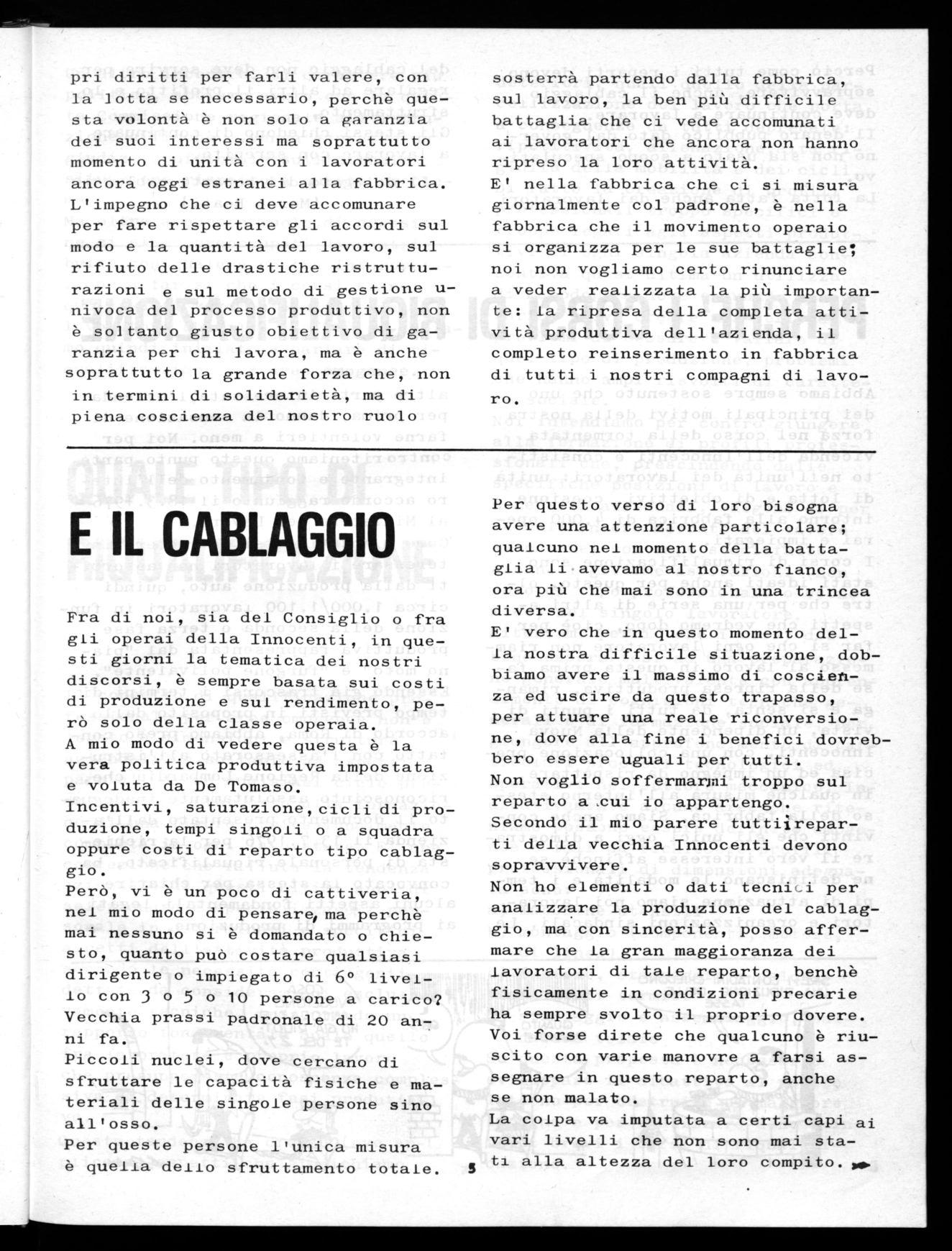 Fra di noi, sia del Consiglio o fra gli operai della Innocenti, in questi giorni la tematica dei nostri discorsi, è sempre basata sui costi di produzione e sul rendimento, però solo della classe operaia. A mio modo di vedere questa è la vera politica produttiva impostata e voluta da De Tomaso.