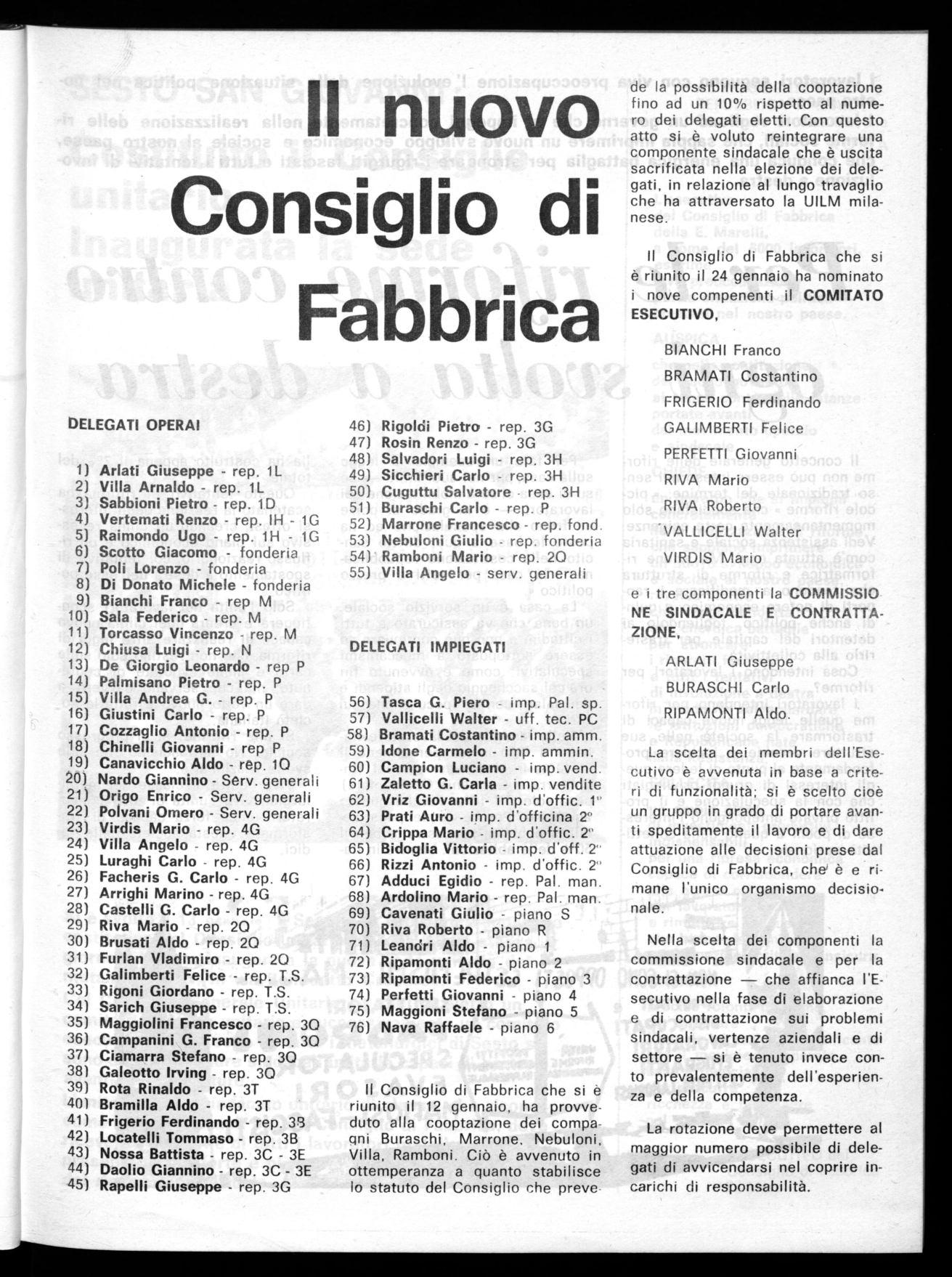 Il Consiglio di Fabbrica che si è riunito il 12 gennaio, ha provveduto alla cooptazione dei compagni Buraschi, Marrone, Nebuloni, Villa, Ramboni. Ciò è avvenuto in ottemperanza a quanto stabilisce lo statuto del Consiglio che preve