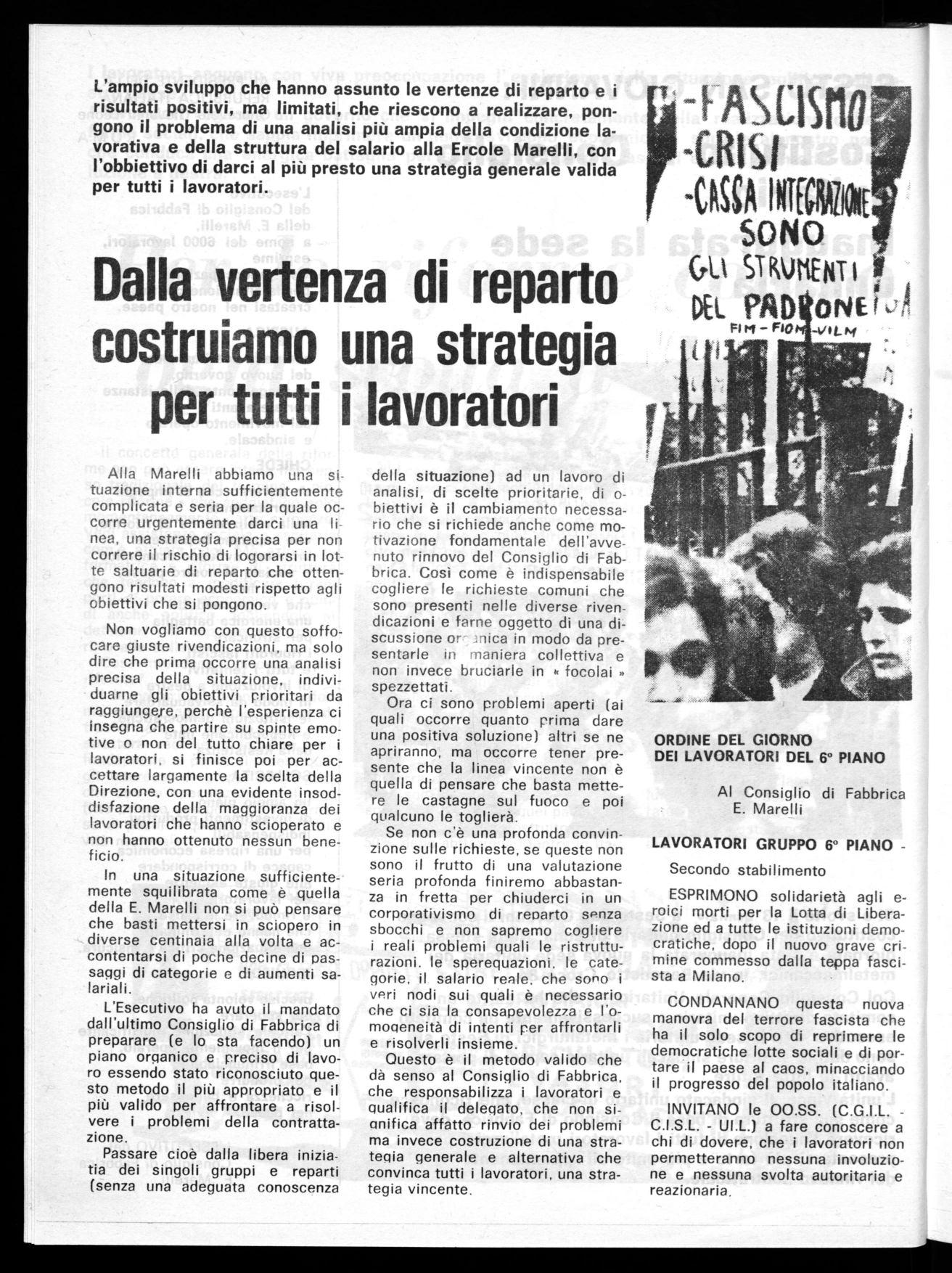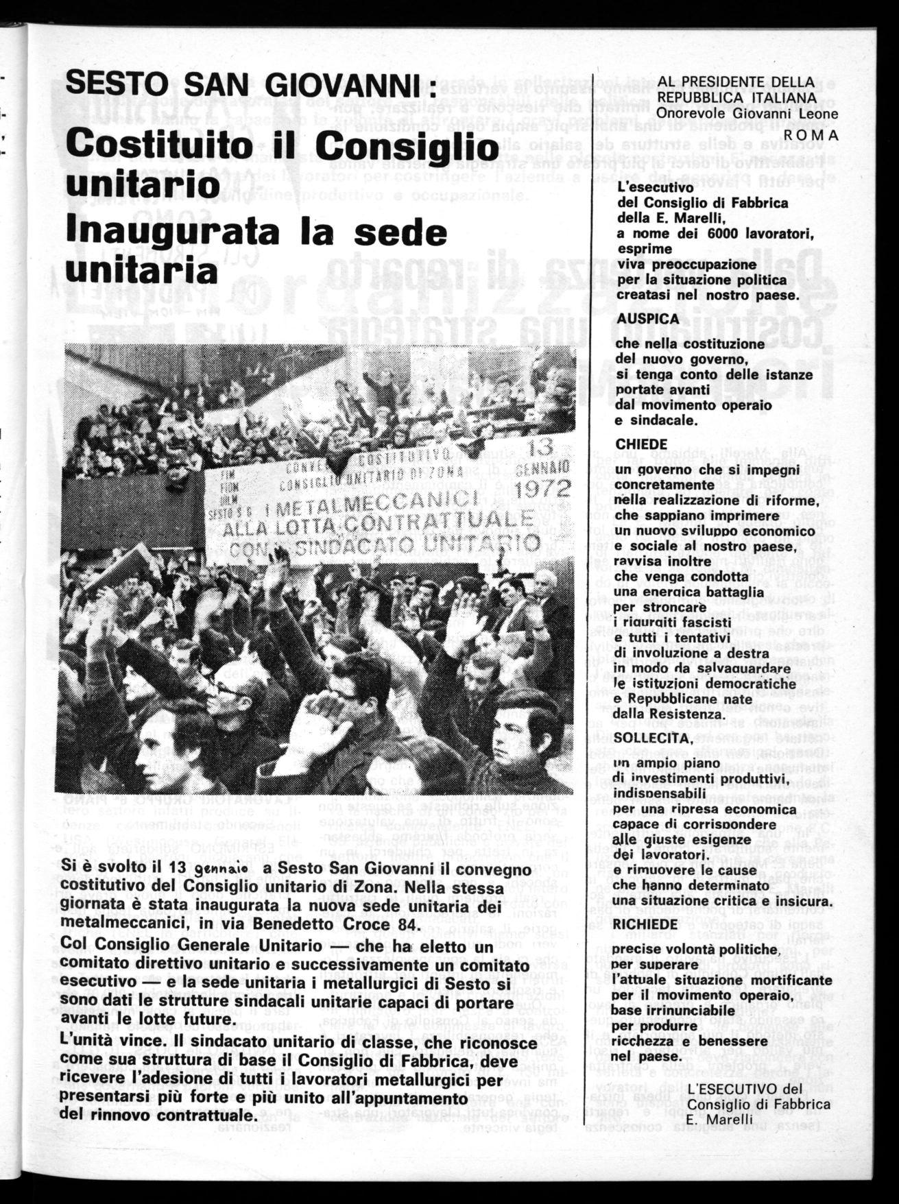 L'esecutivo del Consiglio di Fabbrica della E. Marelli, a nome dei 6000 lavoratori, esprime viva preoccupazione per la situazione politica creatasi nel nostro paese.