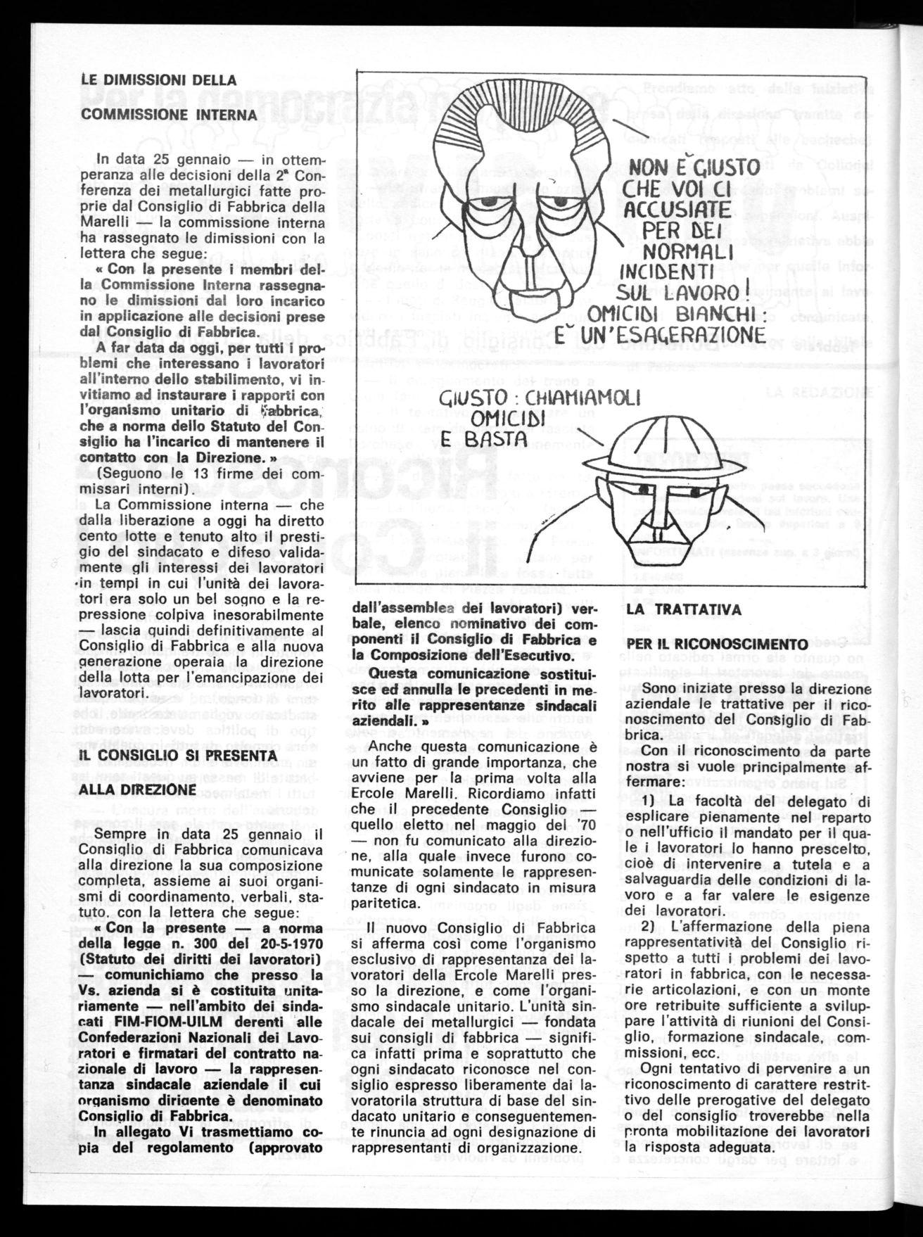 Anche questa comunicazione è un fatto di grande importanza, che avviene per la prima volta alla Ercole Marelli. Ricordiamo infatti che il precedente Consiglio — quello eletto nel maggio del '70 — non fu comunicato alla direzione, alla quale invece furono comunicate solamente le rappresentanze di ogni sindacato in misura paritetica.