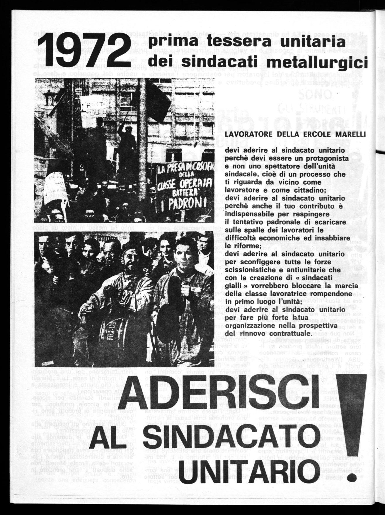 devi aderire al sindacato unitario per sconfiggere tutte le forze scissionistiche e antiunitarie che con la creazione di « sindacati gialli » vorrebbero bloccare la marcia della classe lavoratrice rompendone in primo luogo l'unità; devi aderire al sindacato unitario per fare più forte tatua organizzazione nella prospettiva del rinnovo contrattuale. ADERISCI
