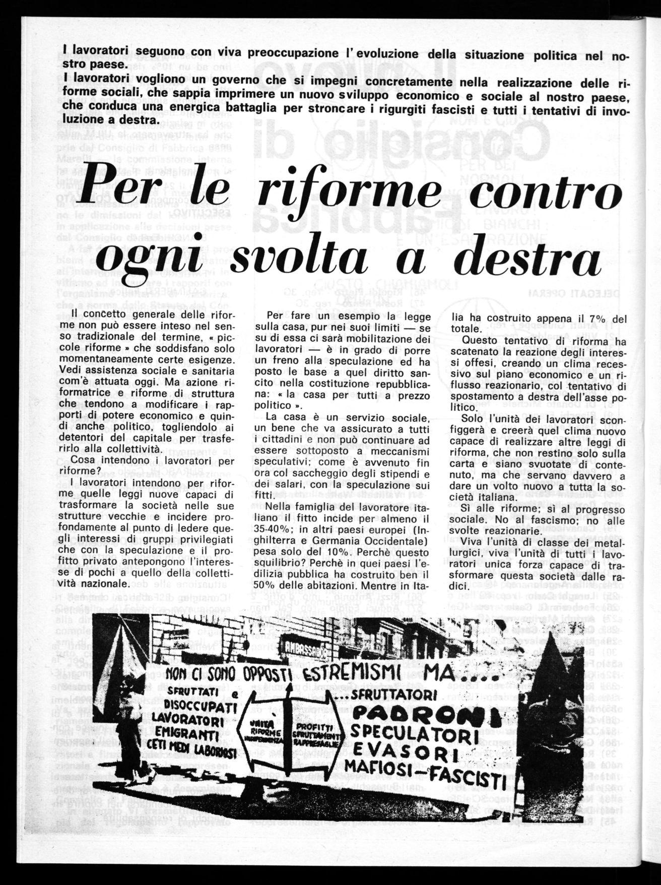 I lavoratori intendono per riforme quelle leggi nuove capaci di trasformare la società nelle sue strutture vecchie e incidere profondamente al punto di ledere quegli interessi di gruppi privilegiati che con la speculazione e il profitto privato antepongono l'interesse di pochi a quello della collettività nazionale.