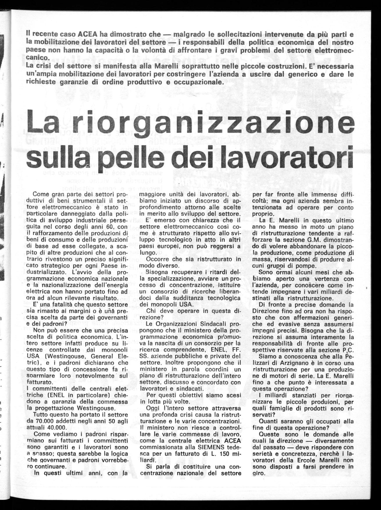 Di fronte a precise domande la Direzione fino ad ora non ha risposto che con affermazioni generiche ed evasive senza assumersi impegni precisi. Bisogna che la direzione si assuma interamente la responsabilità di fronte alle prospettive riservate alla sezione P.C. Siamo a conoscenza che alla Pelizzari di Arzignano è in corso una ristrutturazione per una produzione di motori di serie. La E. Marellí fino a che punto è interessata a questa operazione?