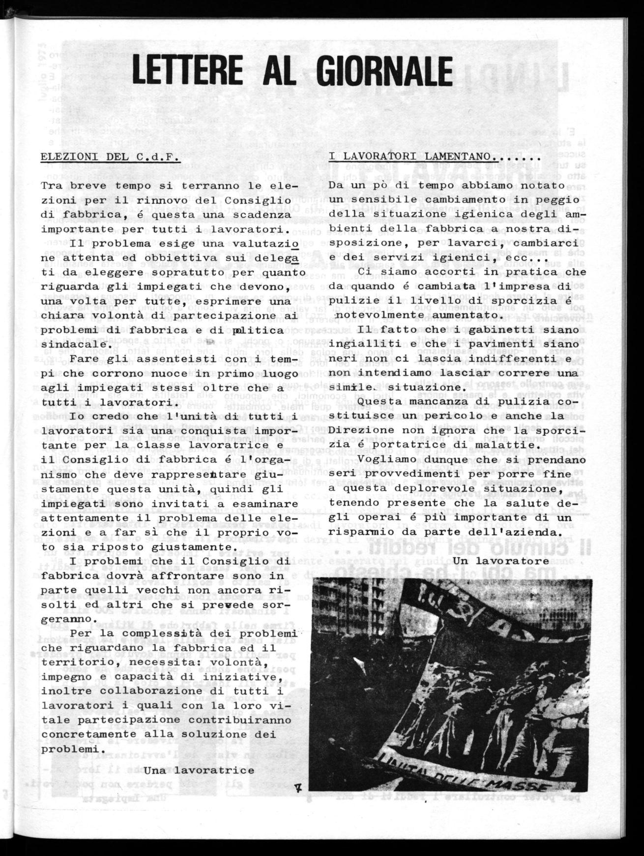 Io credo che l'unità di tutti lavoratori sia una conquista importante per la classe lavoratrice e il Consiglio di fabbrica é l'organismo che deve rappresentare giustamente questa unità , quindi gli impiegati sono invitati a esaminare attentamente il problema delle elezioni e a far sì che il proprio vo-