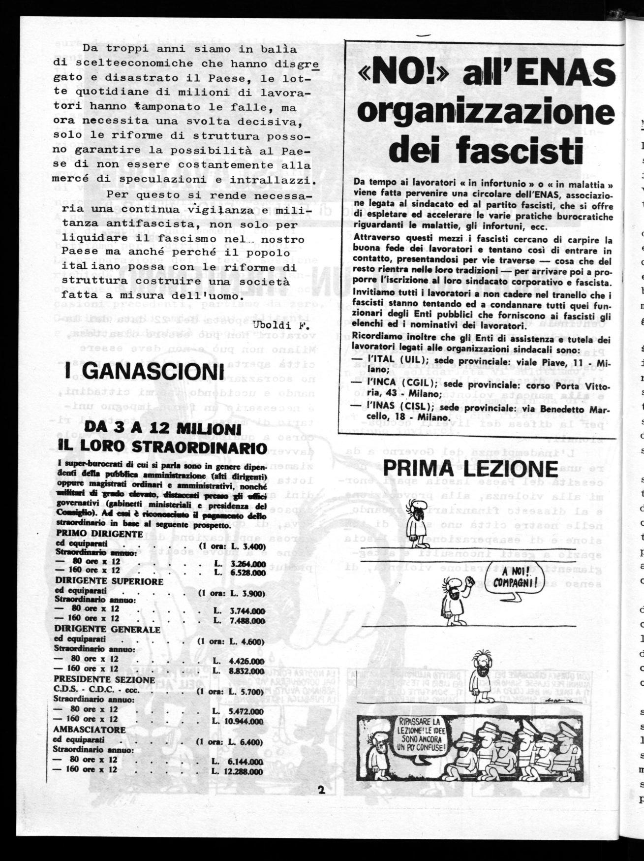 Attraverso questi mezzi i fascisti cercano di carpire la buona fede dei lavoratori e tentano così di entrare in contatto, presentandosi per vie traverse — cosa che del resto rientra nelle loro tradizioni — per arrivare poi a proporre l'iscrizione al loro sindacato corporativo e fascista. Invitiamo tutti i lavoratori a non cadere nel tranello che i fascisti stanno tentando ed a condannare tutti quei funzionari degli Enti pubblici che forniscono ai fascisti gli elenchi ed i nominativi dei lavoratori.