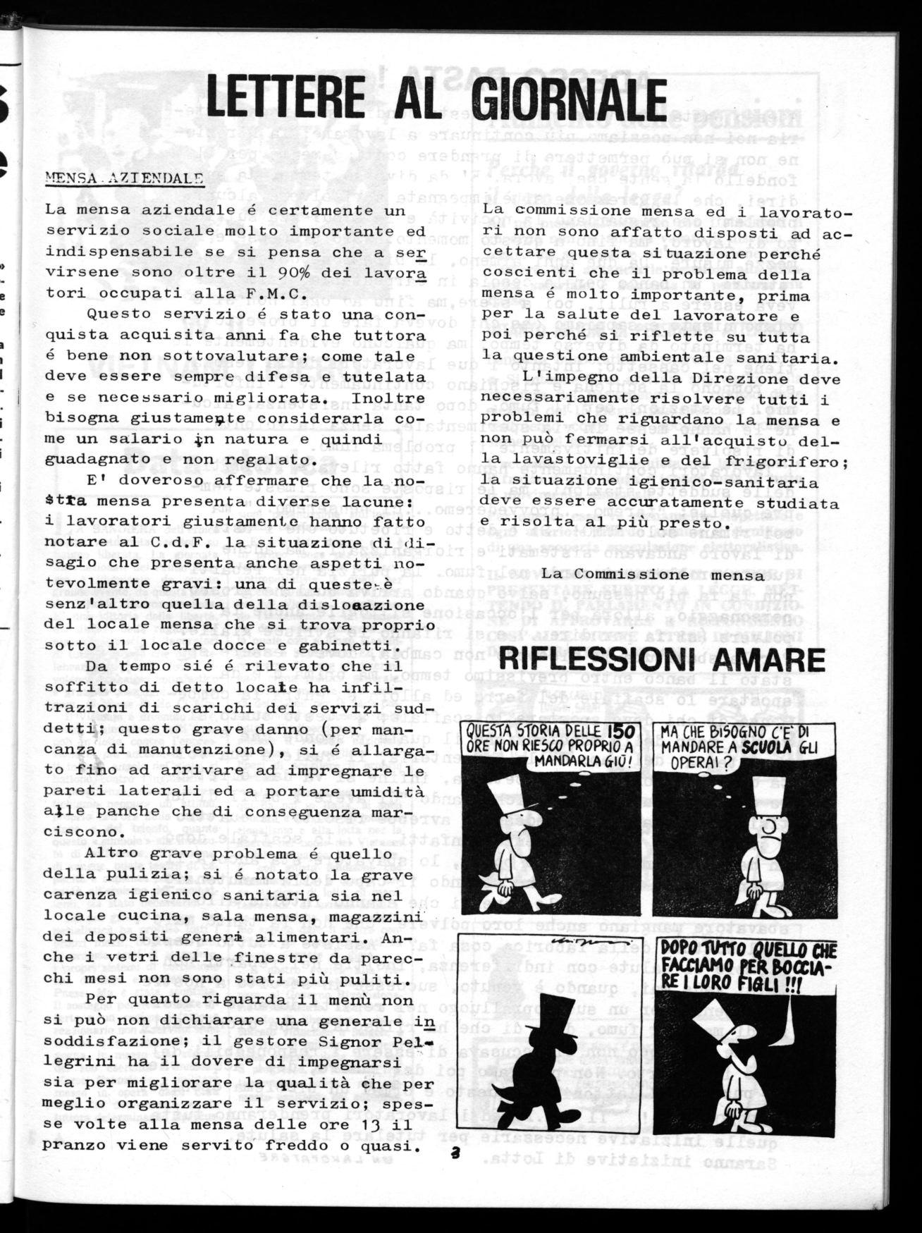 La commissione mensa ed i lavoratori non sono affatto disposti ad accettare questa situazione perché coscienti che il problema della mensa é molto importante, prima per la salute del lavoratore e poi perché si riflette su tutta la questione ambientale sanitaria. L'impegno della Direzione deve necessariamente risolvere tutti i problemi che riguardano la mensa e non può fermarsi all'acquisto della lavastoviglie e del frigorifero; la situazione igienico-sanitaria deve essere accuratamente studiata e risolta al più presto.