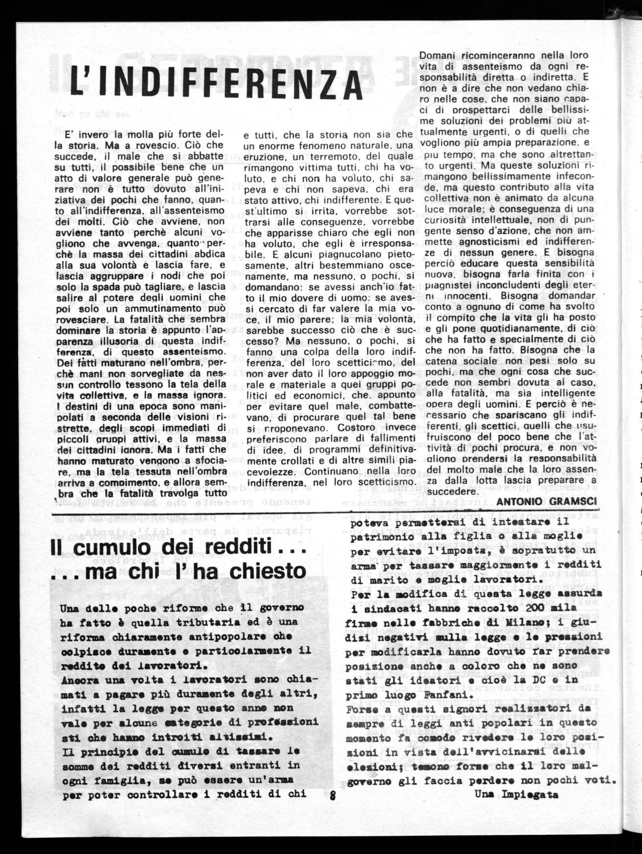 Domani ricominceranno nella loro vita di assenteismo da ogni responsabilità diretta o indiretta. E non è a dire che non vedano chiaro nelle cose. che non siano capaci di prospettarci delle bellissime soluzioni dei problemi più attualmente urgenti, o di quelli che vogliono più ampia preparazione. e piu tempo. ma che sono altrettanto urgenti. Ma queste soluzioni rimangono bellissimamente infeconde, ma questo contributo alla vita collettiva non è animato da alcuna luce morale; è conseguenza di una curiosità intellettuale, non di pungente senso d'azione, che non ammette agnosticismi ed indifferenze di nessun genere. E bisogna perciò educare questa sensibilità nuova, bisogna farla finita con i piagnistei inconcludenti degli eterni innocenti. Bisogna domandar conto a ognuno di come ha svolto il compito che la vita gli ha posto e gli pone quotidianamente. di ciò che ha fatto e specialmente di ciò che non ha fatto. Bisogna che la catena sociale non pesi solo su pochi, ma che ogni cosa che succede non sembri dovuta ai caso, alla fatalità , ma sia intelligente opera degli uomini. E perciò è necessario che spariscano gli indifferenti, gli scettici, auelli che t'sufruiscono del poco bene che l'attività di pochi procura, e non vogliono prendersi la responsabilità del molto male che la loro assenza dalla lotta lascia preparare a succedere.