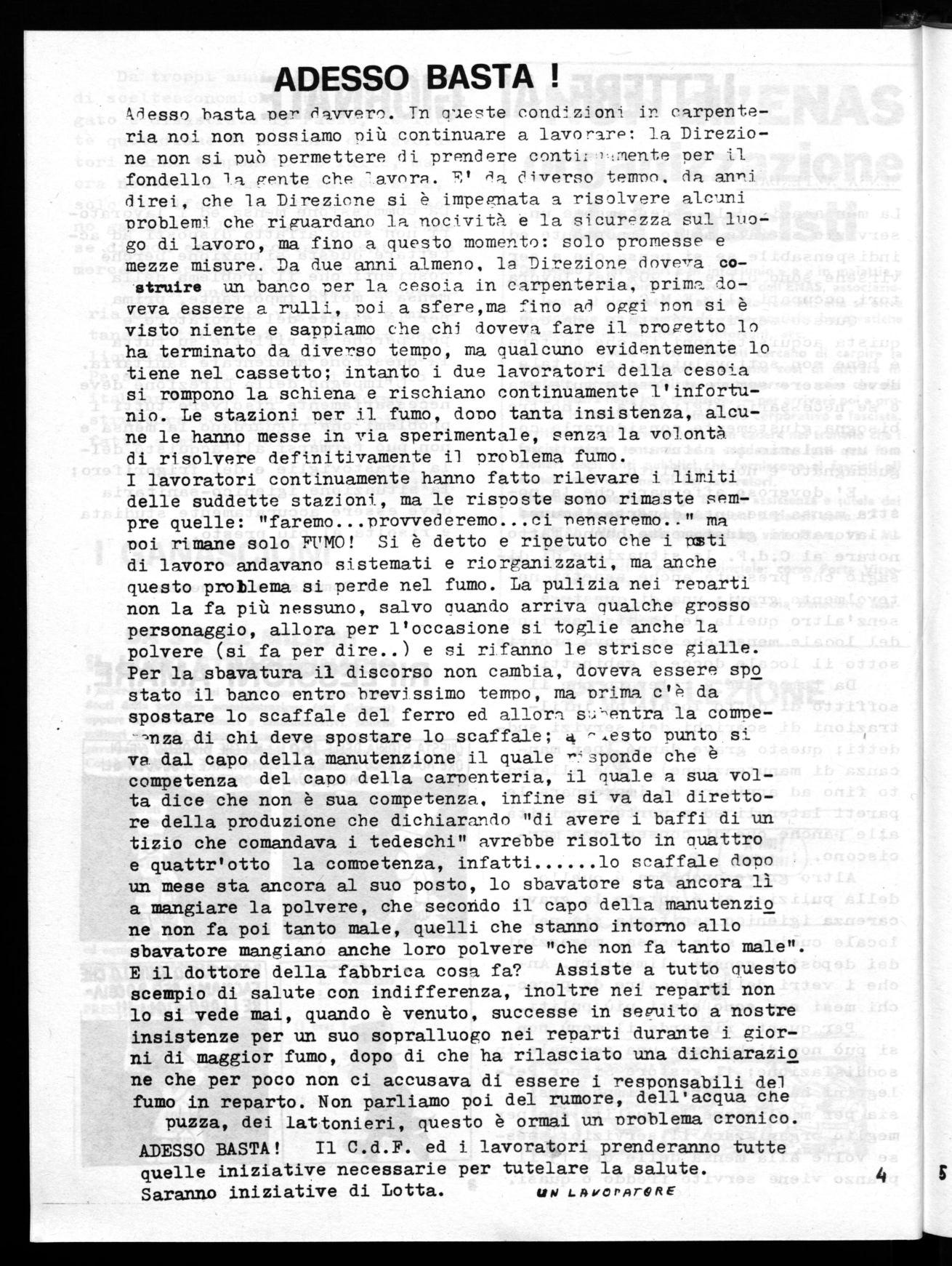 ,esso basta per davvero. In queste condizioni in carpenteria noi non possiamo niù continuare a lavorare: la Direzione non si pue) permettere di prendere contilu,tmente per il fondello la gente che -avnra. 7' da diverso temnn. da anni direi, che la Direzione si è impegnata a risolvere alcuni problemi che riguardano la nocività é la sicurezza sul luogo di lavoro, ma fino a questo momento: solo promesse e mezze misure. Da due anni almeno, le Direzione doveva costruire un banco per la cesoia in carpenteria, primn_ doveva essere a rulli, poi a sfere,me fino ad oggi non si è visto niente e sappiamo che chi doveva fare il progetto lo ha terminato da diverso tempo, ma qualcuno evidentemente lo tiene nel cassetto; intanto i due lavoratori della cesoia si rompono la schiena e rischiano continuamente l'infortunio. Le stazioni per il fumo, doro tanta insistenza, alcune le hanno messe in via sperimentale, senza la volontà di risolvere definitivamente il problema fumo. I lavoratori continuamente hanno fatto rilevare i limiti delle suddette stazioni, ma le risposte sono rimaste sempre quelle: "faremo...provvederemo...ci rerseremo.." ma noi rimane solo FUMO! Si è detto e ripetuto che i rati di lavoro andavano sistemati e riorganizzati, ma anche questo problema si perde nel fumo. La pulizia nei reparti non la fa più nessuno, salvo quando arriva qualche grosso personaggio, allora per l'occasione si toglie anche la polvere (si fa per dire..) e si rifanno le strisce gialle. Per la sbavatura il discorso non cambia, doveva essere spo stato il banco entro brevissimo tempo, ma prima c'è da spostare lo scaffale del ferro ed allora su"-entra la come,nza di chi deve spostare lo scaffale; 4 -esto punto si ve dal capo della manutenzione il quale Y.sponde che è competenza del capo della carrenteria, il quale a sua volta dice che non è sua competenza, infine si va dal direttore della produzione che dichiarando "di avere i baffi di un tizio che comandava i tedeschi" avrebbe risolto in quattro e quattr'otto la competenza, infatti lo scaffale dopo un mese sta ancora al suo posto, lo sbavatore sta ancora lì a mangiare la polvere, che secondo il capo della manutenzio ne non fa poi tanto male, quelli che stanno intorno allo sbavatore mangiano anche loro polvere "che non fa tanto male". E il dottore della fabbrica cosa fa? Assiste a tutto questo scempio di salute con indifferenza, inoltre nei reparti non lo si vede mai, quando è venuto, successe in seguito a nostre insistenze per un suo sopralluogo nei reparti durante i giorni di maggior fumo, dopo di che ha rilasciato una dichiarazio ne che per poco non ci accusava di essere i responsabili del fumo in reparto. Non parliamo poi del rumore, dell'acqua che puzza, dei lattonieri, questo è ormai un problema cronico.