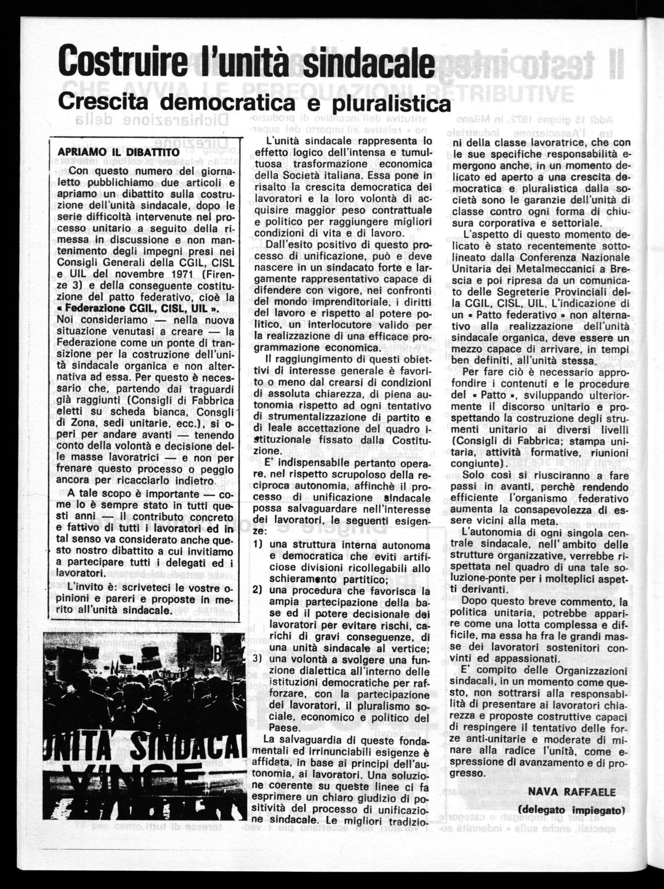 Con questo numero del giornaletto pubblichiamo due articoli e apriamo un dibattito sulla costruzione dell'unità sindacale, dopo le serie difficoltà intervenute nel processo unitario a seguito della rimessa in discussione e non mantenimento degli impegni presi nei Consigli Generali della CGIL, CISL e UIL del novembre 1971 (Firenze 3) e della conseguente costituzione del patto federativo, cioè la s Federazione CGIL, CISL, UIL ». Noi consideriamo — nella nuova situazione venutasi a creare — la Federazione come un ponte di transizione per la costruzione dell'unità sindacale organica e non alternativa ad essa. Per questo è necessario che, partendo dai traguardi già raggiunti (Consigli di Fabbrica eletti su scheda bianca, Consgli di Zona, sedi unitarie, ecc.), si operi per andare avanti — tenendo conto della volontà e decisione delle masse lavoratrici — e non per frenare questo processo o peggio ancora per ricacciarlo indietro.