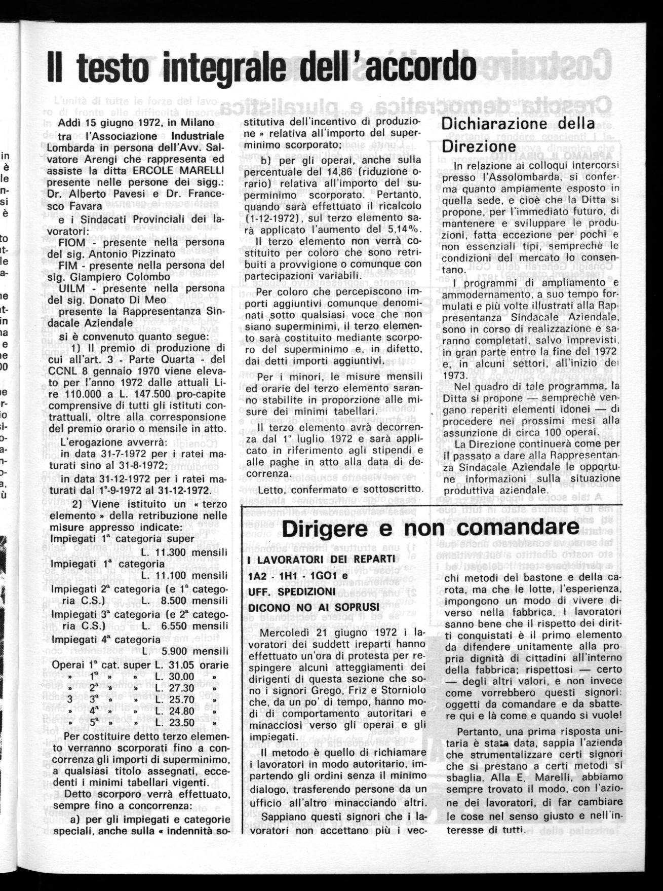 Addì 15 giugno 1972, in Milano tra l'Associazione Industriale Lombarda in persona dell'Avv. Salvatore Arengi che rappresenta ed assiste la ditta ERCOLE MARELLI presente nelle persone dei sigg.: Or. Alberto Pavesi e Dr. Francesco Favara e i Sindacati Provinciali dei lavoratori: