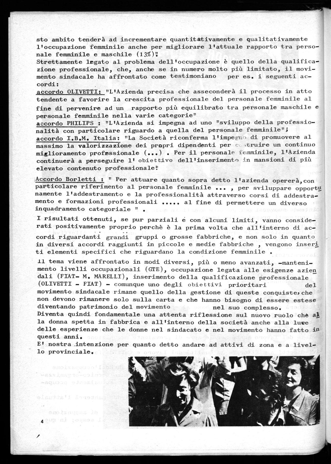 accordo I.B.M. Italia: "La Società riconferma l'impeglr, di promuovere al massimo la valorizzazione dei propri dipendenti per ,truire un continuo miglioramento professionale (...) . Per il personale femminile, l'Azienda continuerà a perseguire l' obiettivo dell'inserimento in mansioni di più elevato contenuto professionale':