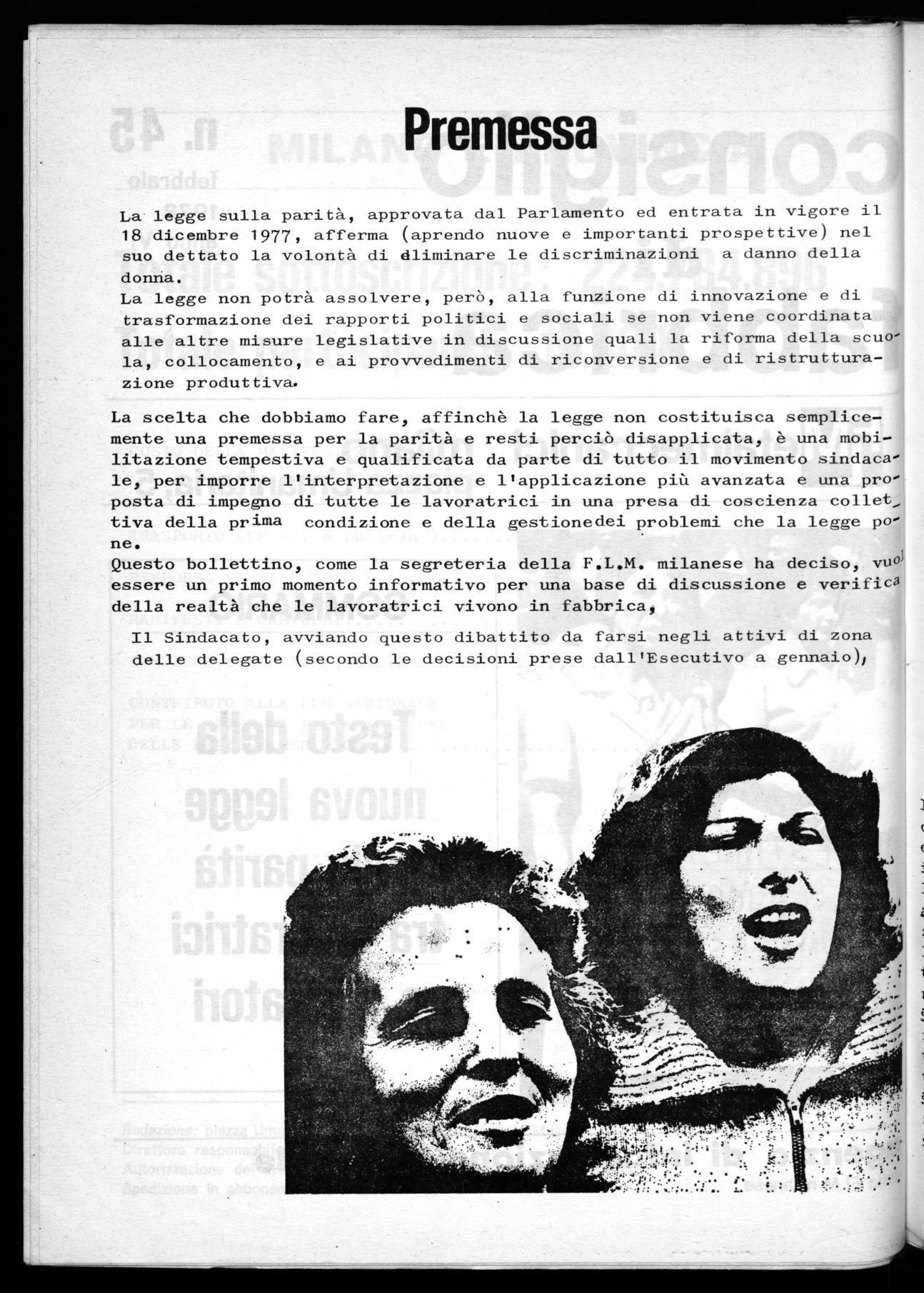 Questo bollettino, come la segreteria della F.L.M. milanese ha deciso, vuo essere un primo momento informativo per una base di discussione e verifica della realtà che le lavoratrici vivono in fabbrica,
