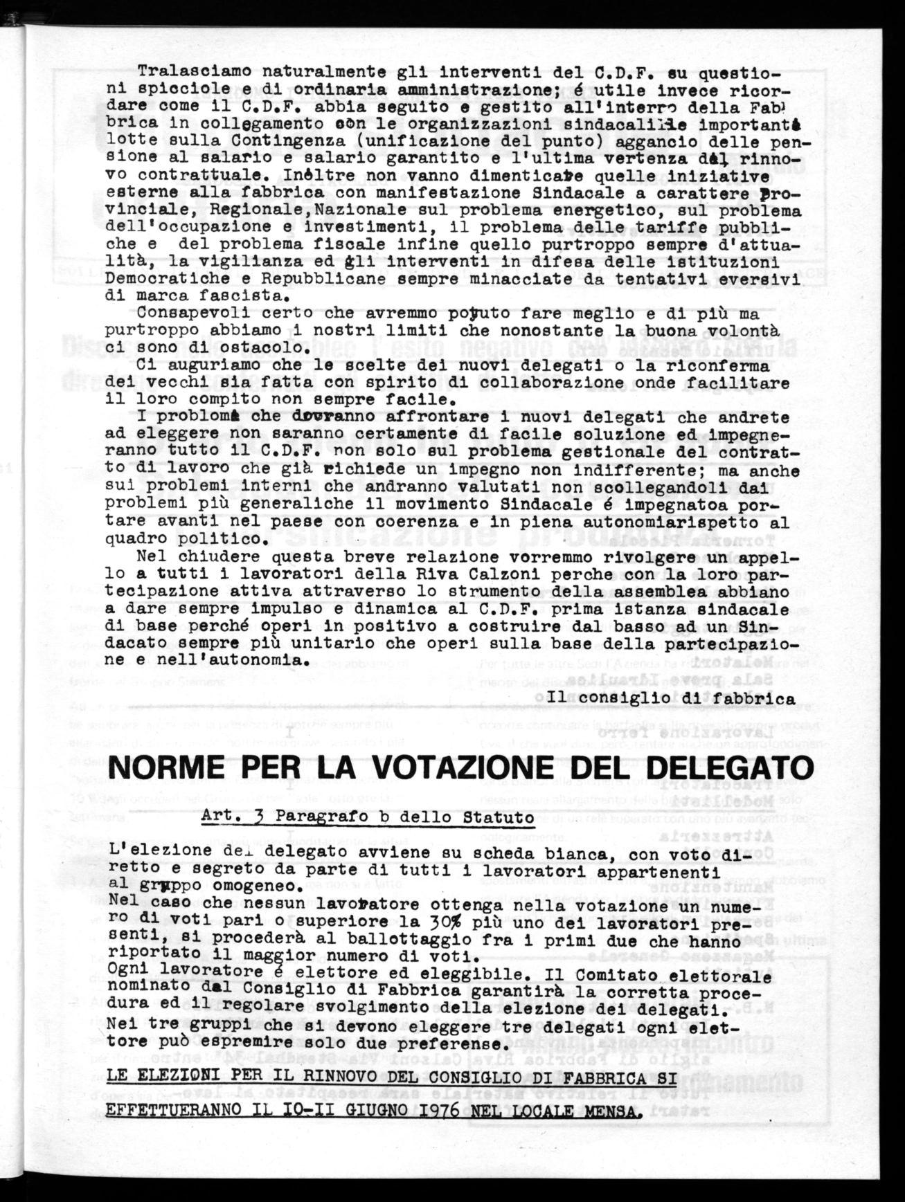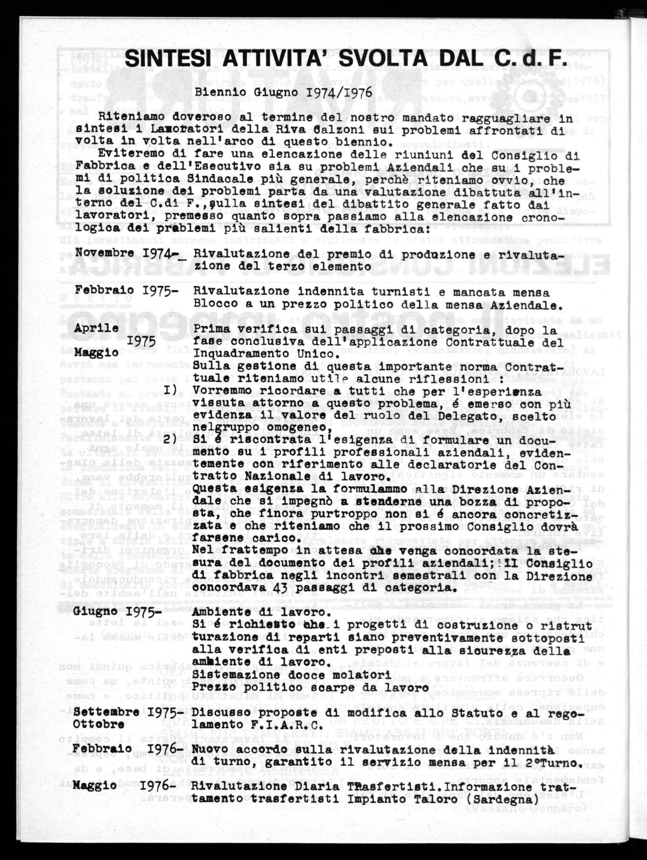 Nel chiudere questa breve relazione vorremmo rivolgere un appello a tutti i lavoratori della Riva Calzoni perche con la loro partecipazione attiva attraverso lo strumento della assemblea abbiano a dare sempre impulso e dinamica al C.D.F. prima istanza sindacale di base perché operi in positivo a costruire dal basso ad un Sindacato sempre più unitario che operi sulla base della partecipazione e nell'autonomia.