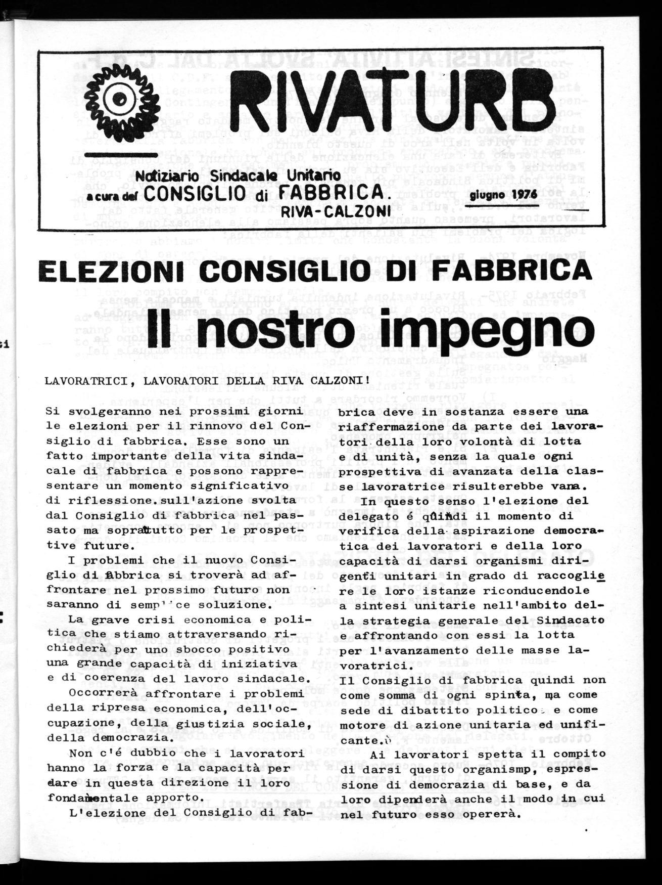 Notiziario Sindacale Unitario a cura dof CONSIGLIO di FABBRICA. RIVA-CALZONI giugno 1976
