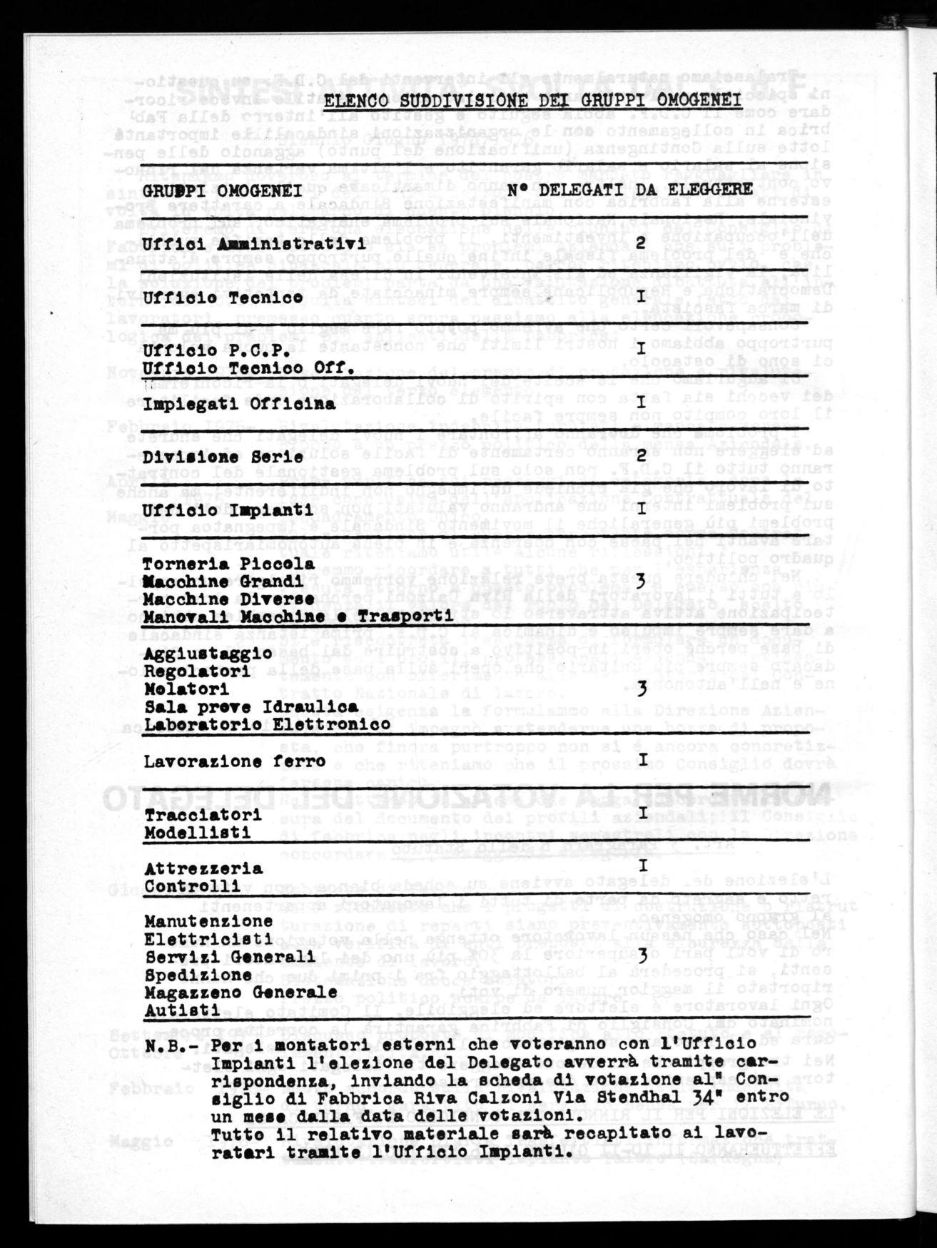 Il consiglio di fabbricaN.B.- Per i montatori esterni che voteranno con l'Ufficio Impianti l'elezione del Delegato avverrà tramite ~rispondenza, inviando la scheda di votazione al° Consiglio di Fabbrica Riva Calzoni Via Stendhal 34' entro un mese dalla data delle votazioni.