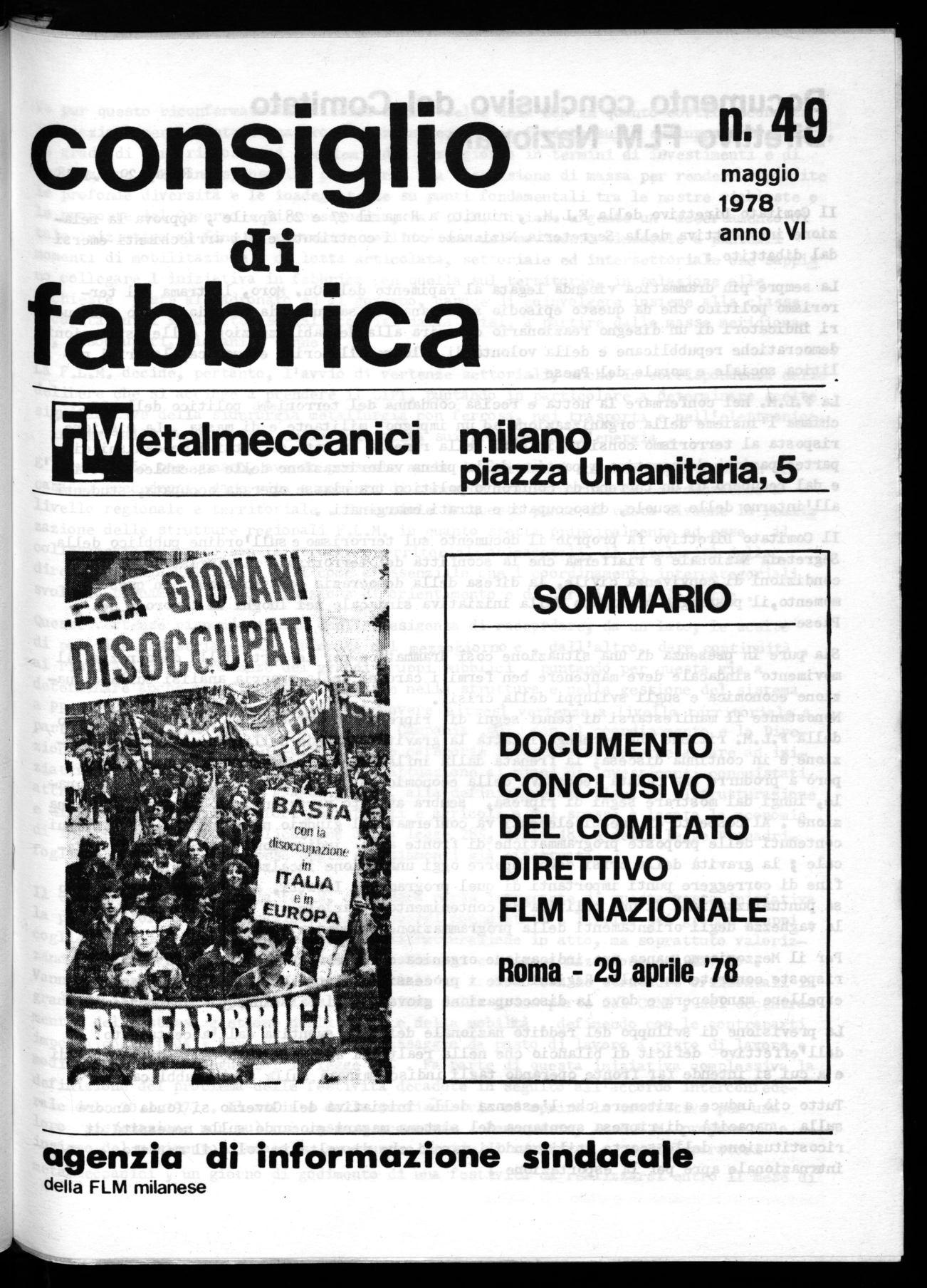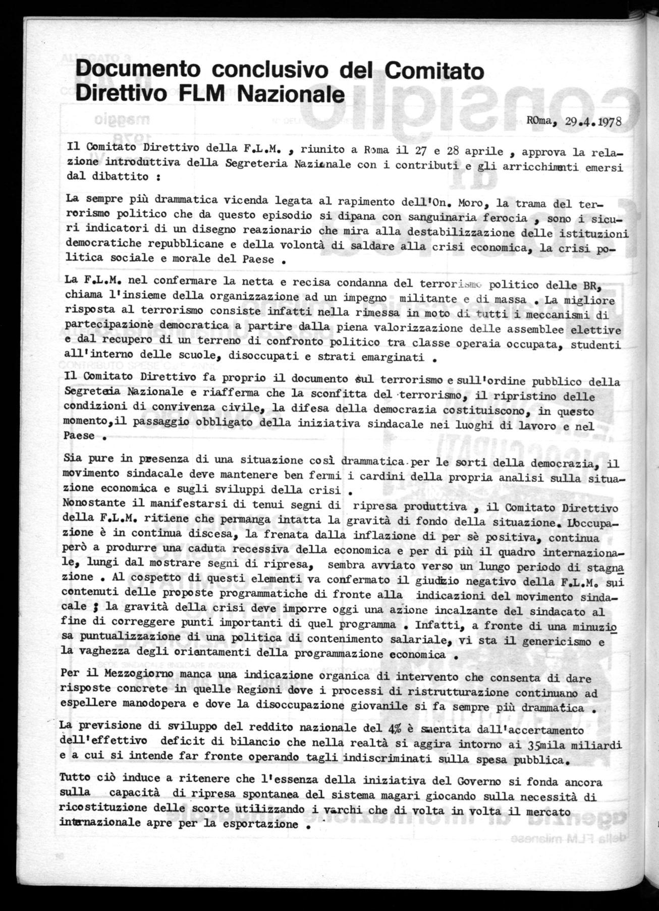 La F.L.M. nel confermare la netta e recisa condanna del terrorj., politico delle BR, chiama l'insieme della organizzazione ad un impegno militante e di massa . La migliore risposta al terrorismo consiste infatti nella rimessa in moto di tatti i meccanismi di partecipazione democratica a partire dalla piena valorizzazione delle assemblee elettive e dal recupero di un terreno di confronto politico tra classe operaia occupata, studenti all'interno delle scuole, disoccupati e strati emarginati .
