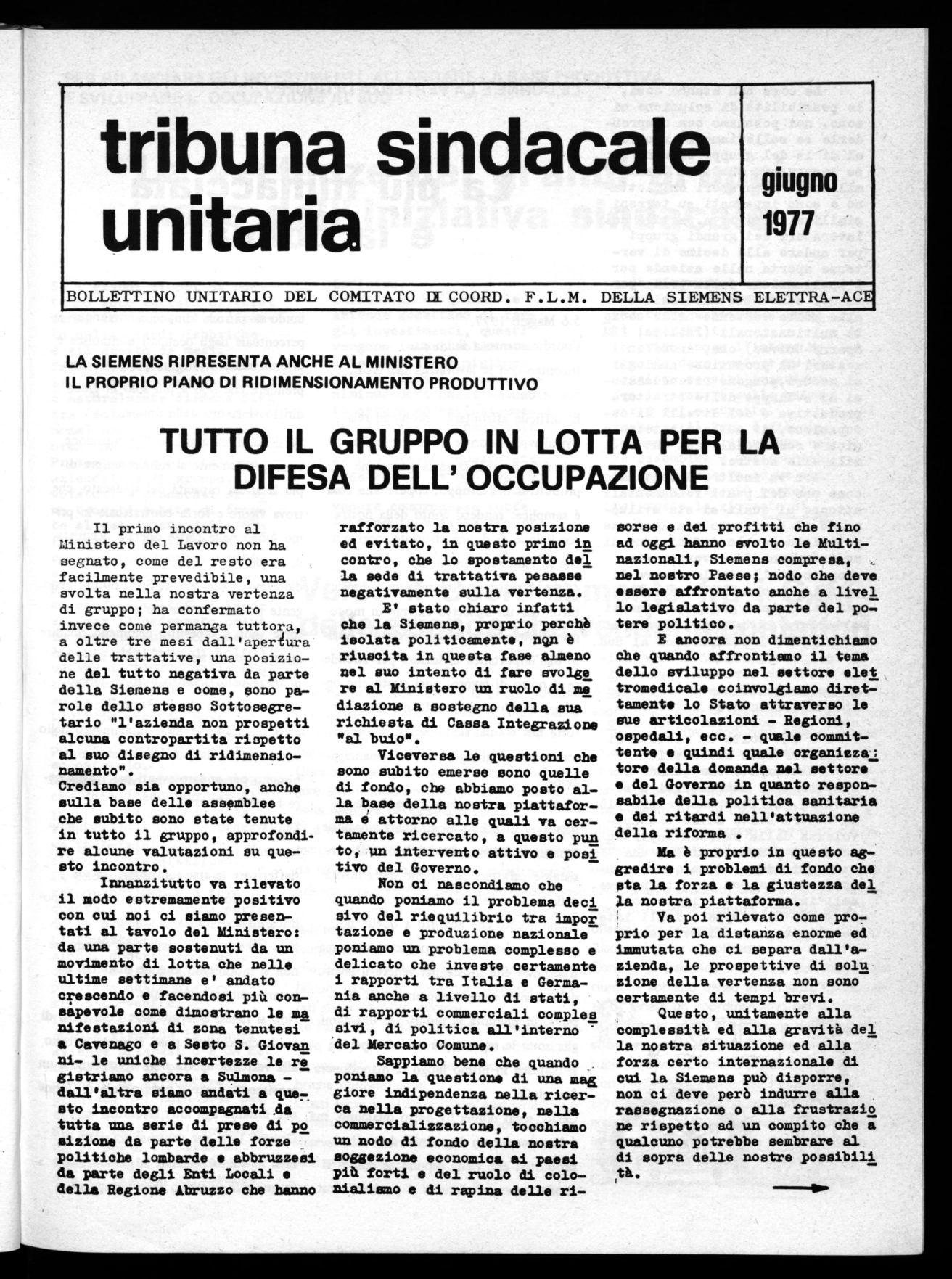 BOLLETTINO UNITARIO DEL COMITATO DE COORD. F L M DELLA SIEMENS ELETTRA ACE