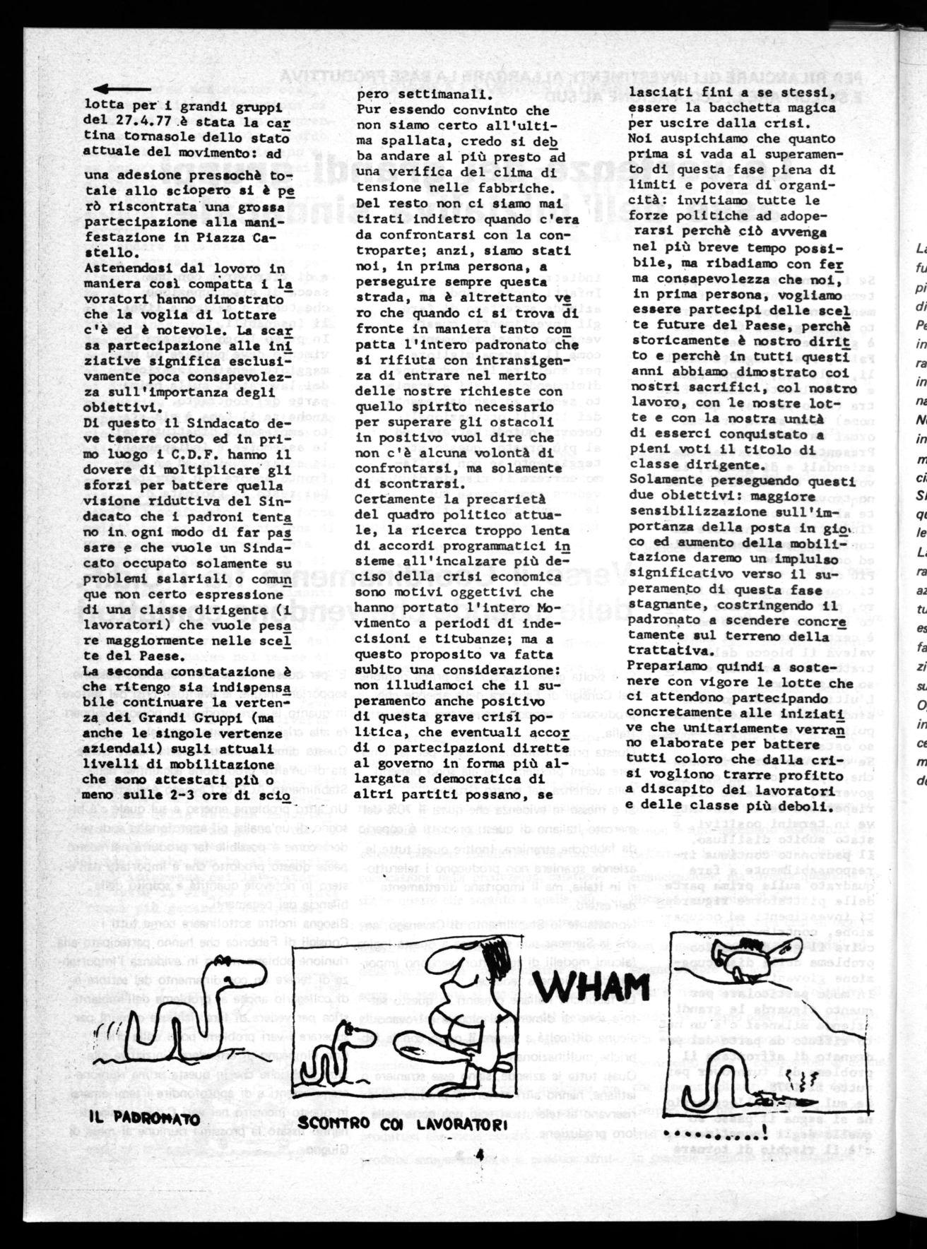 Di questo il Sindacato deve tenere conto ed in primo luogo i C.D.F. hanno il dovere di moltiplicare gli sforzi per battere quella visione riduttiva del Sindacato che i padroni tenta no in ogni modo di far pas sere e che vuole un Sindacato occupato solamente su problemi salariali o comun que non certo espressione di una classe dirigente (i lavoratori) che vuole pesa re maggiormente nelle scel te del Paese.