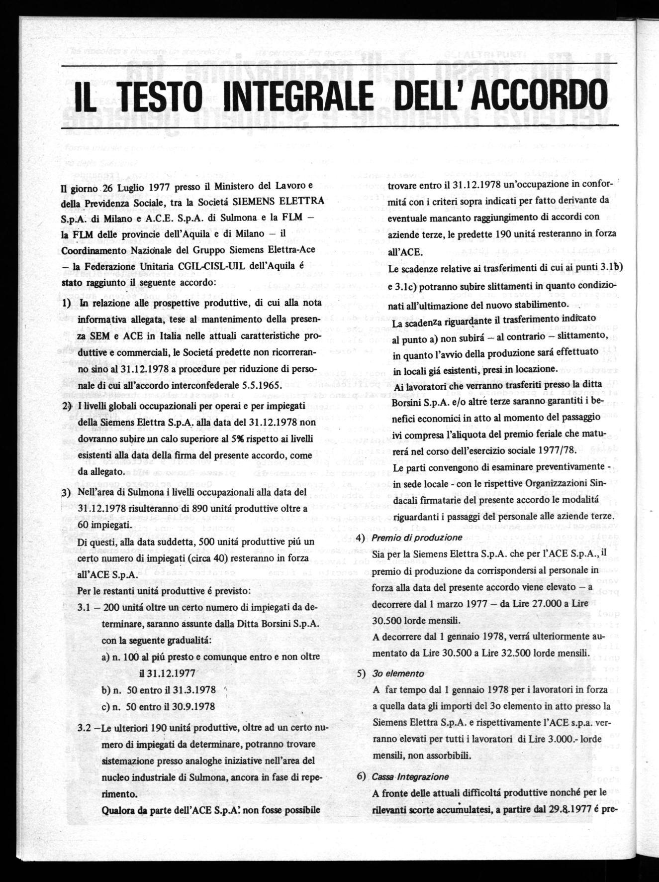 Il giorno 26 Luglio 1977 presso il Ministero del Lavoro e della Previdenza Sociale, tra la Società SIEMENS ELETTRA S.p.A. di Milano e A.C.E. S.p.A. di Sulmona e la FLM — la FLM delle provincie dell'Aquila e di Milano — il Coordinamento Nazionale del Gruppo Siemens Elettra-Ace — la Federazione Unitaria CGIL-CISL-UIL dell'Aquila é stato raggiunto il seguente accordo: