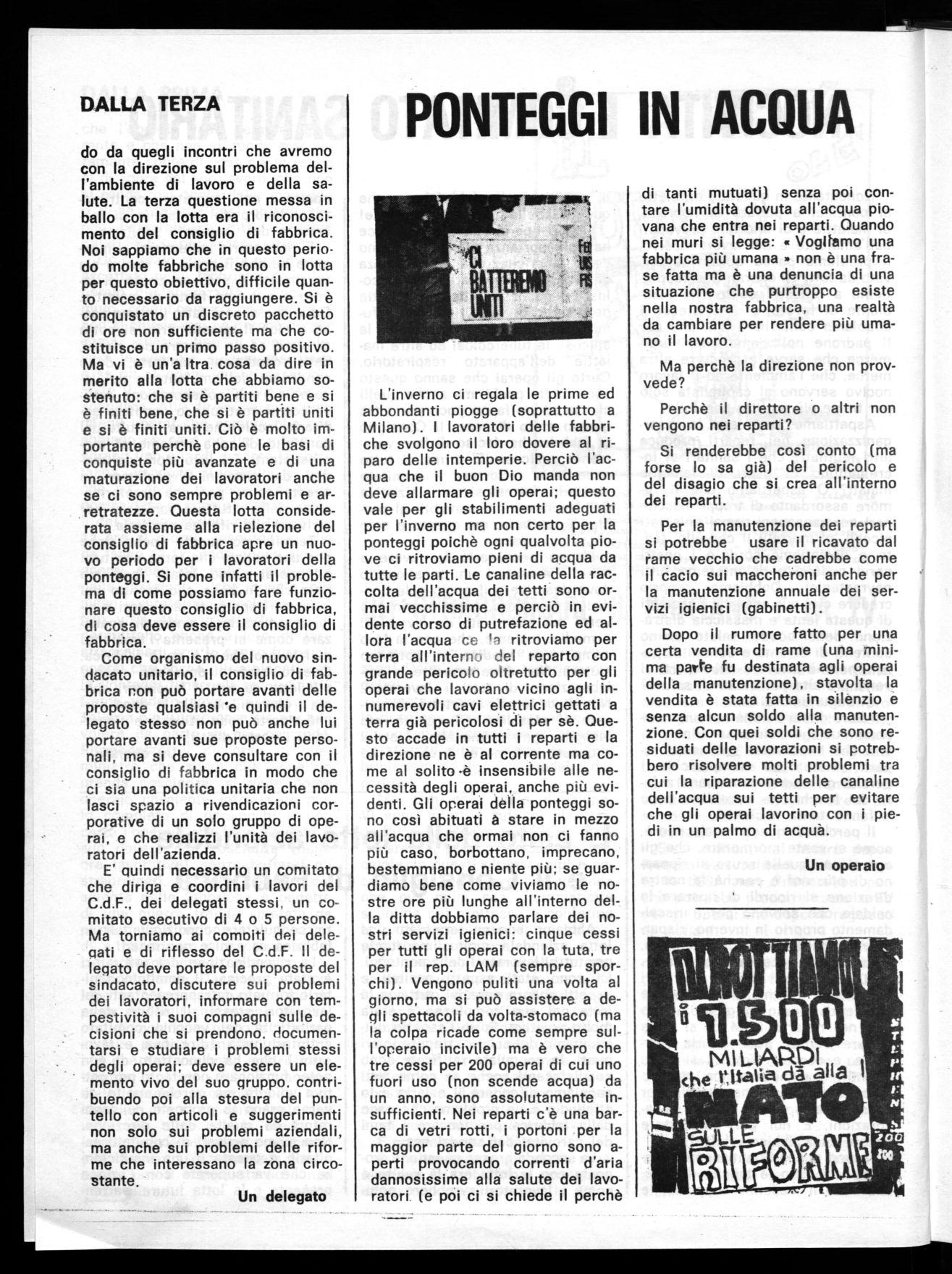 L'inverno ci regala le prime ed abbondanti piogge (soprattutto a Milano). I lavoratori delle fabbriche svolgono il loro dovere al riparo delle intemperie. Perciò l'acqua che il buon Dio manda non deve allarmare gli operai; questo vale per gli stabilimenti adeguati per l'inverno ma non certo per la ponteggi poichè ogni qualvolta piove ci ritroviamo pieni di acqua da tutte le parti. Le canaline della raccolta dell'acqua dei tetti sono ormai vecchissime e perciò in evidente corso di putrefazione ed allora l'acqua cc 'i ritroviamo per terra all'intern , dei reparto con grande pericolo oltretutto per gli operai che lavorano vicino agli innumerevoli cavi elettrici gettati a terra già pericolosi di per sè. Questo accade in tutti i reparti e la direzione ne è al corrente ma come al solito -è insensibile alle necessità degli operai, anche più evidenti. Gli operai della ponteggi sono così abituati à stare in mezzo all'acqua che ormai non ci fanno più caso, borbottano, imprecano, bestemmiano e niente più; se guardiamo bene come viviamo le nostre ore più lunghe all'interno della ditta dobbiamo parlare dei nostri servizi igienici: cinque cessi per tutti gli operai con la tuta, tre per il rep. LAM (sempre sporchi). Vengono puliti una volta al giorno, ma si può assistere a degli spettacoli da volta-stomaco (ma la colpa ricade come sempre sull'operaio incivile) ma è vero che tre cessi per 200 operai di cui uno fuori uso (non scende acqua) da un anno, sono assolutamente insufficienti. Nei reparti c'è una barca di vetri rotti, i portoni per la maggior parte del giorno sono aperti provocando correnti d'aria dannosissime alla salute dei lavoratori (e poi ci si chiede il perchè
