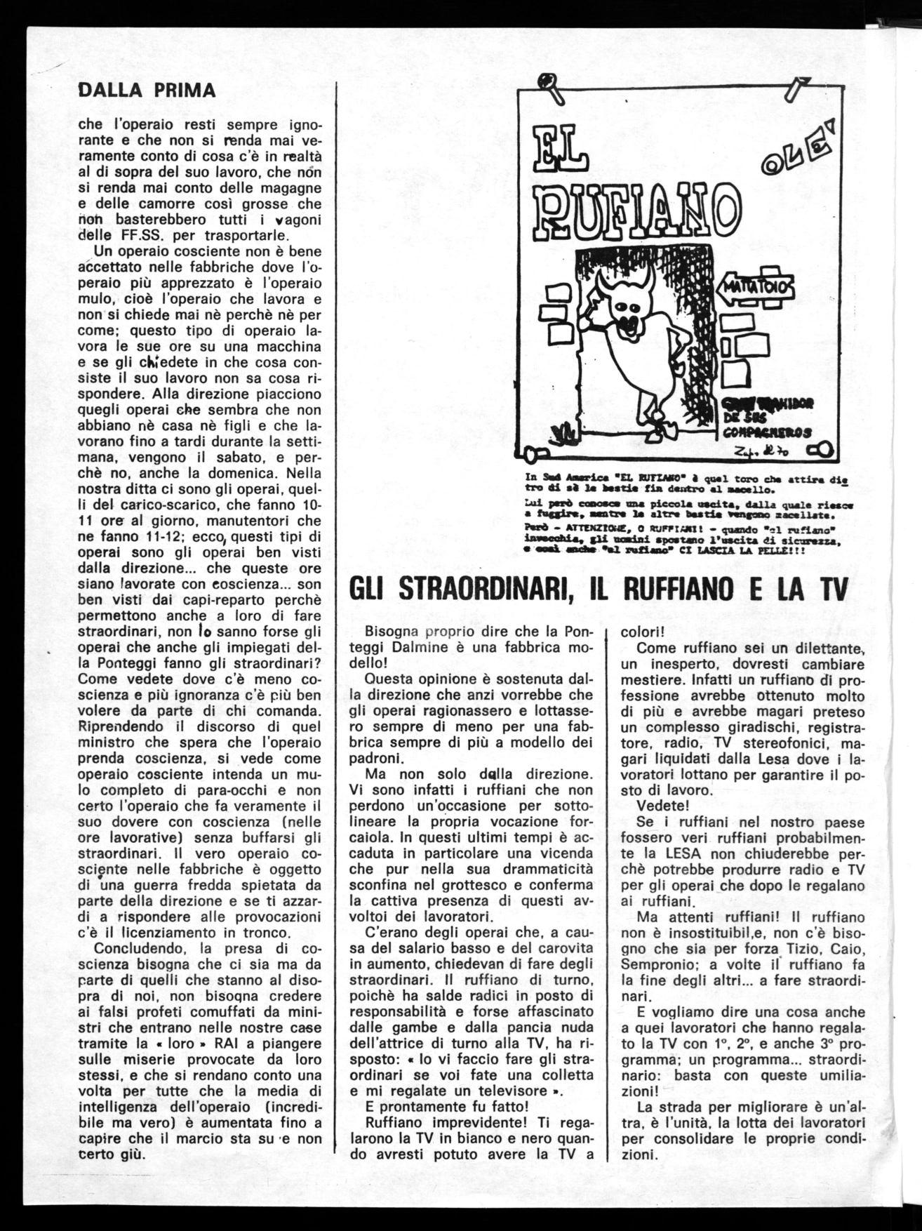 Un operaio cosciente non è bene accettato nelle fabbriche dove l'operaio più apprezzato è l'operaio mulo, cioè l'operaio che lavora e non si chiede mai nè perchè nè per come; questo tipo di operaio lavora le sue ore su una macchina e se gli cWedete in che cosa consiste il suo lavoro non sa cosa rispondere. Alla direzione piacciono quegli operai che sembra che non abbiano nè casa nè figli e che lavorano fino a tardi durante la settimana, vengono il sabato, e perchè no, anche la domenica. Nella nostra ditta ci sono gli operai, quelli del carico-scarico, che fanno 1011 ore al giorno, manutentori che ne fanno 11-12; ecco, questi tipi di operai sono gli operai ben visti dalla direzione... che queste ore siano lavorate con coscienza... son ben visti dai capi-reparto perchè permettono anche a loro di fare straordinari, non lo sanno forse gli operai che anche gli impiegati della Ponteggi fanno gli straordinari? Come vedete dove c'è meno coscienza e più ignoranza c'è più ben volere da parte di chi comanda. Riprendendo il discorso di quel ministro che spera che l'operaio prenda coscienza, si vede come operaio cosciente intenda un mulo completo di para-occhi e non certo l'operaio che fa veramente il suo dovere con coscienza (nelle ore lavorative) senza buffarsi gli straordinari. Il vero operaio cosciente nelle fabbriche è oggetto di una guerra fredda spietata da parte della direzione e se ti azzardi a rispondere alle provocazioni c'è il licenziamento in tronco.