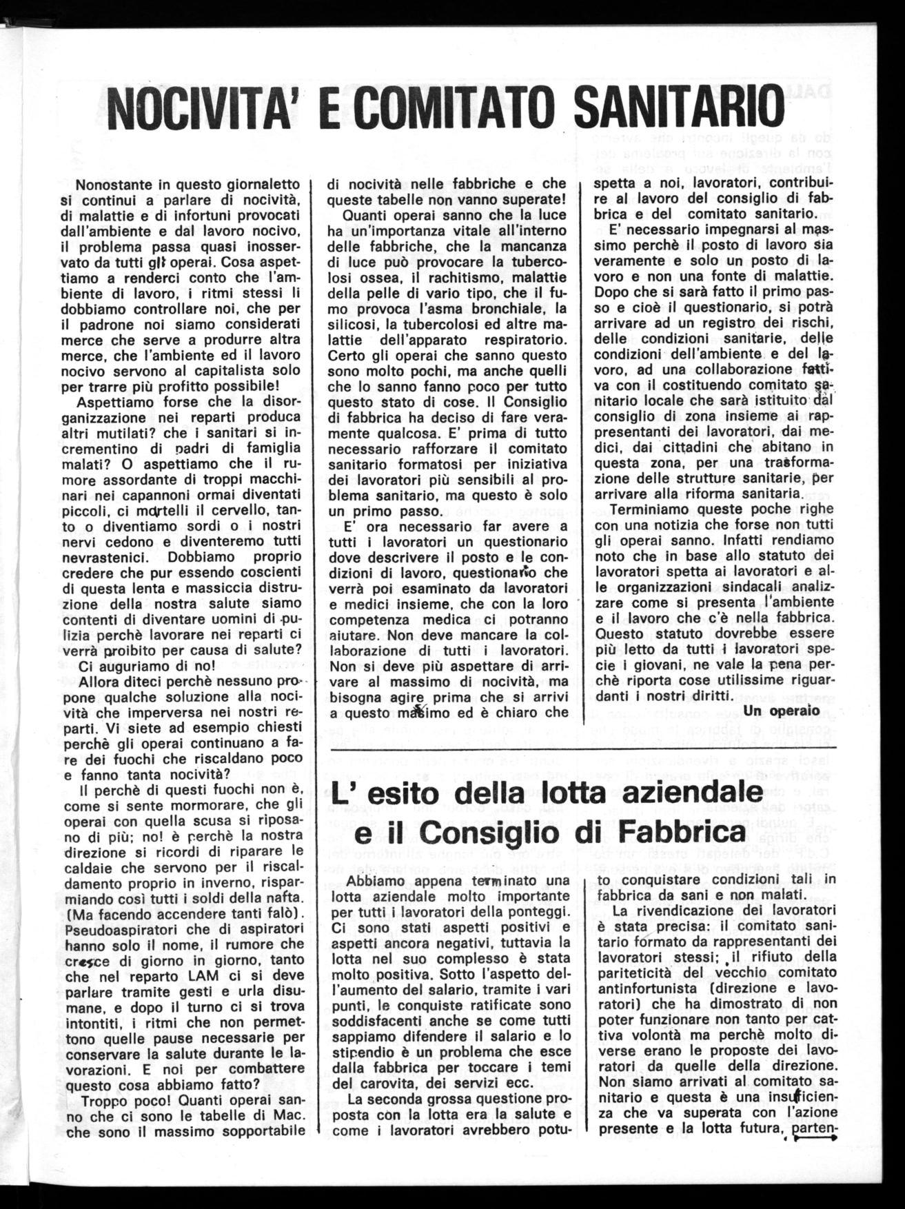 di nocività nelle fabbriche e che queste tabelle non vanno superate! Quanti operai sanno che la luce ha un'importanza vitale all'interno delle fabbriche, che la mancanza di luce può provocare la tubercolosi ossea, il rachitismo, malattie della pelle di vario tipo, che il fumo provoca l'asma bronchiale, la silicosi, la tubercolosi ed altre malattie dell'apparato respiratorio. Certo gli operai che sanno questo sono molto pochi, ma anche quelli che lo sanno fanno poco per tutto questo stato di cose. Il Consiglio di fabbrica ha deciso di fare veramente qualcosa. E' prima di tutto necessario rafforzare il comitato sanitario formatosi per iniziativa dei lavoratori più sensibili al problema sanitario, ma questo è solo un primo passo.