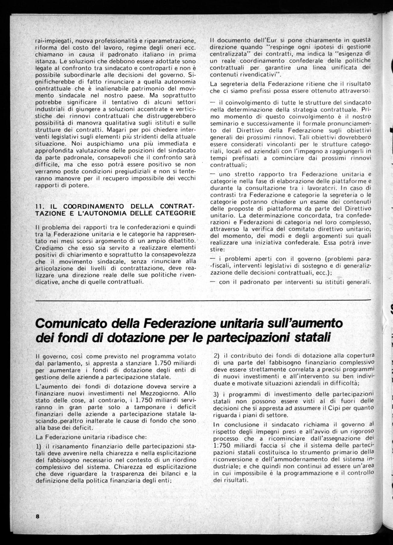 Il problema dei rapporti tra le confederazioni e quindi tra la Federazione unitaria e le categorie ha rappresentato nei mesi scorsi argomento di un ampio dibattito. Crediamo che esso sia servito a realizzare elementi positivi di chiarimento e soprattutto la consapevolezza che il movimento sindacale, senza rinunciare alla articolazione dei livelli di contrattazione, deve realizzare una direzione reale delle sue politiche rivendicative, anche di quelle contrattuali.