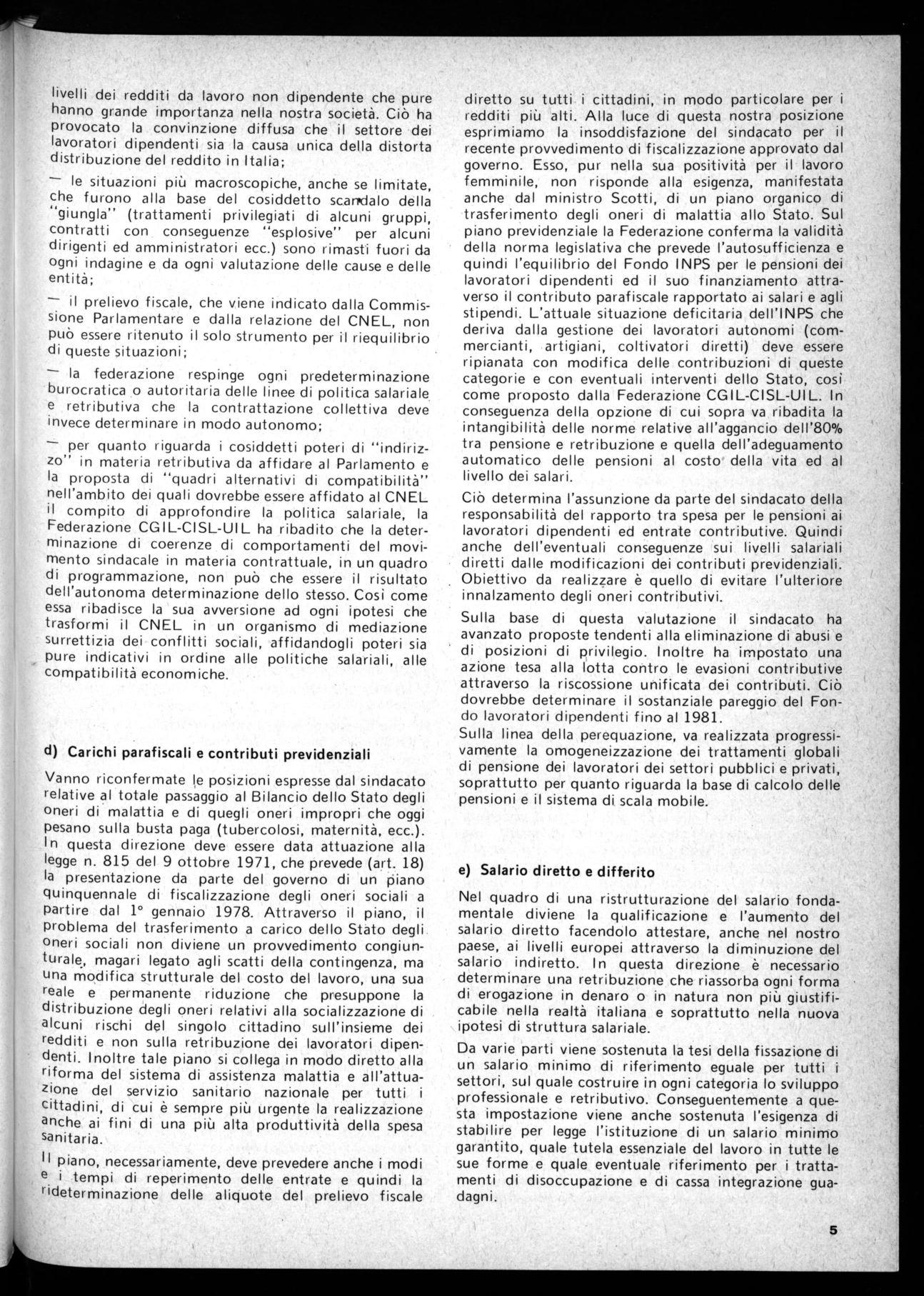 Vanno riconfermate I,e posizioni espresse dal sindacato relative al totale passaggio al Bilancio dello Stato degli oneri di malattia e di quegli oneri impropri che oggi pesano sulla busta paga (tubercolosi, maternità, ecc.). In questa direzione deve essere data attuazione alla legge n. 815 del 9 ottobre 1971, che prevede (art. 18) la presentazione da parte del governo di un piano quinquennale di fiscalizzazione degli oneri sociali a Partire dal 1° gennaio 1978. Attraverso il piano, il problema del trasferimento a carico dello Stato degli oneri sociali non diviene un provvedimento congiunturale, magari legato agli scatti della contingenza, ma una modifica strutturale del costo del lavoro, una sua reale e permanente riduzione che presuppone la distribuzione degli oneri relativi alla socializzazione di alcuni rischi del singolo cittadino sull'insieme dei redditi e non sulla retribuzione dei lavoratori dipendenti. Inoltre tale piano si collega in modo diretto alla riforma del sistema di assistenza malattia e all'attuazione del servizio sanitario nazionale per tutti i cittadini, di cui è sempre più urgente la realizzazione anche ai fini di una più alta produttività della spesa sanitaria.