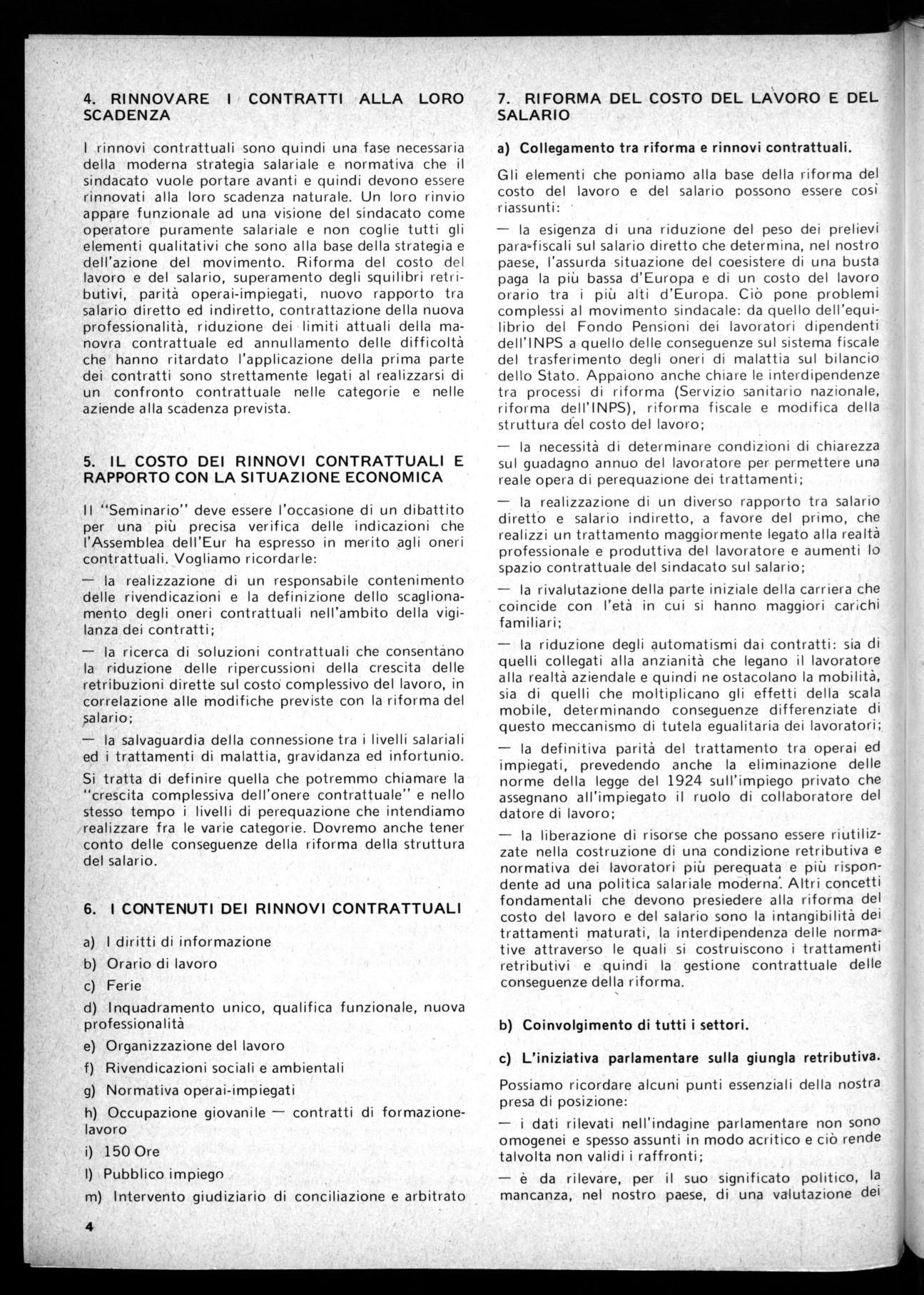 Il "Seminario" deve essere l'occasione di un dibattito per una più precisa verifica delle indicazioni che l'Assemblea dell'Eur ha espresso in merito agli oneri contrattuali. Vogliamo ricordarle:
