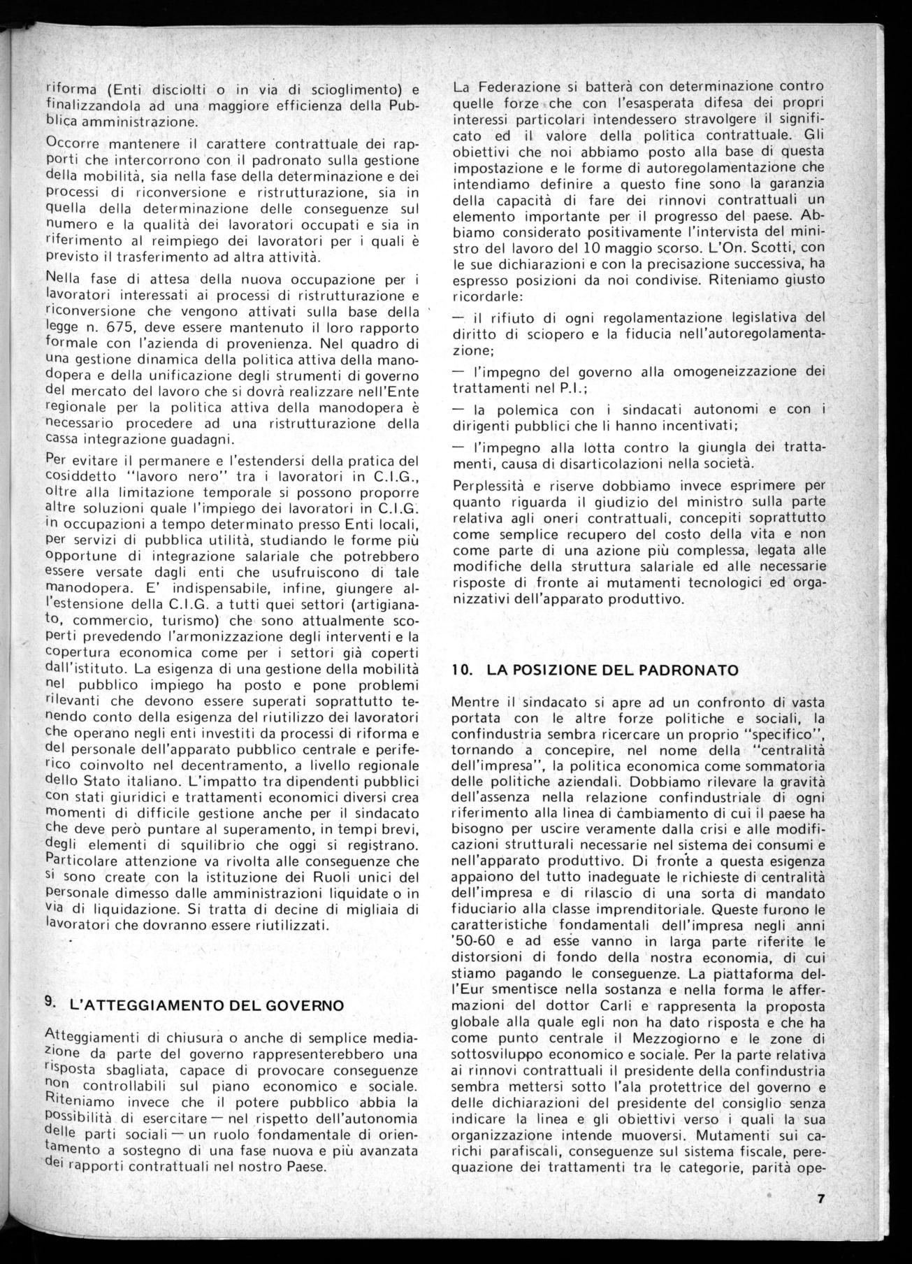 Atteggiamenti di chiusura o anche di semplice mediazione da parte del governo rappresenterebbero una risposta sbagliata, capace di provocare conseguenze non controllabili sul piano economico e sociale. Riteniamo invece che il potere pubblico abbia la Possibilità di esercitare — nel rispetto dell'autonomia delle parti sociali — un ruolo fondamentale di orientamento a sostegno di una fase nuova e più avanzata dei rapporti contrattuali nel nostro Paese.