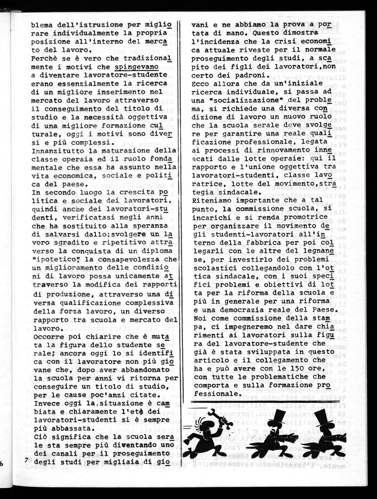 Riteniamo importante che a tal punto, la commissione scuola, si incarichi e si renda promotrice per organizzare il movimento de gli studenti-lavoratori all'in terno della fabbrica per poi col legarli con le altre del legnane se, per investirlo dei problemi scolastici collegandolo con l'ot tica sindacale, con i suoi speci fici problemi e obiettivi di lot ta per la riforma della scuola e più in generale per una riforma e una democrazia reale del Paese. Noi come commissione della stani pa, ci impegneremo nel dare chia rimenti ai lavoratori sulla figa ra del lavoratore-studente che già è stata sviluppata in questo articolo e il collegamento che ha e può avere con le 150 ore, con tutte le problematiche che comporta e sulla formazione pro fessionale.