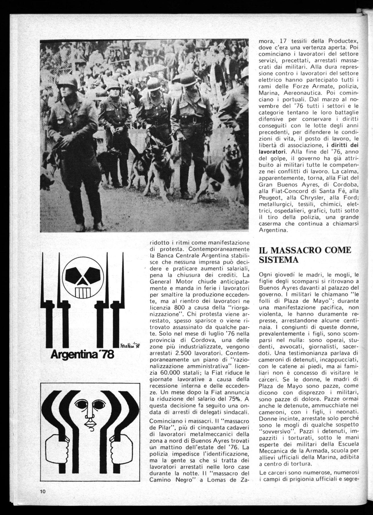 Questa drammatica oppressione non vogliamo solo denunciarla, insieme ad altri intendiamo ricordare una volontà di lotta portata avanti dalle organizzazioni sindacali e operaie; la nostra azione deve essere tesa ad appoggiare tutte le iniziative che a favore della Argentina nascono nelle fabbriche, nelle scuole e nei quartieri. Ma è soprattutto at-