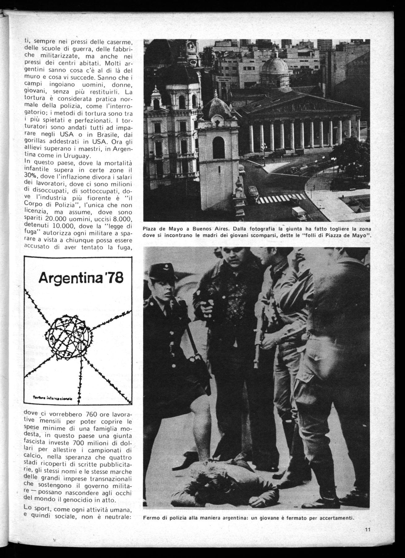 Fermo di polizia alla maniera argentina: un giovane è fermato per accertamenti. Plaza de Mayo a Buenos Aires. Dalla fotografia la giunta ha fatto togliere la zona dove si incontrano le madri dei giovani scomparsi, dette le "folli di Piazza de Mayo".basti ricordare il nazismo e le Olimpiadi di Monaco nel 1938, il massacro della piazza delle Tre Culture a Città del Messico; non è neutrale quindi nemmeno la scelta dei generali argentini, ciò che ci auguriamo è che diventi di segno opposto e trasformi l'immagine di efficienza e pace sociale che la dittatura vorrebbe dare in una immensa denuncia contro il fascismo, contro la repressione antioperaia, contro lo sfruttamento del capitale finanzia-