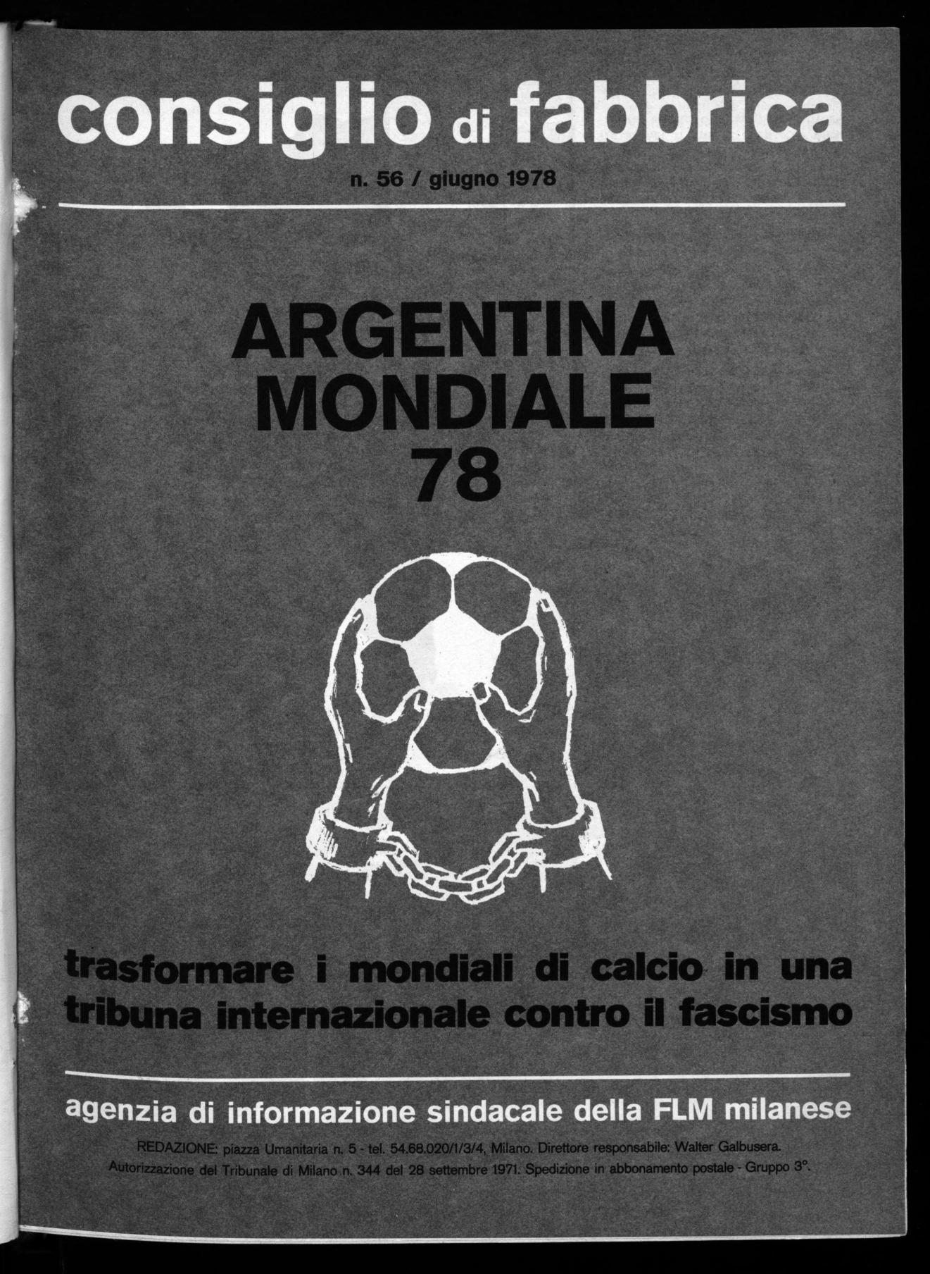 La F.L.M. di Milano ritiene opportuno ricordare a tutti i lavoratori milanesi la situazione di dittatura esistente in Argentina utilizzando l'occasione dei campionati di calcio che si stanno svolgendo in quel paese nel mese di giugno.