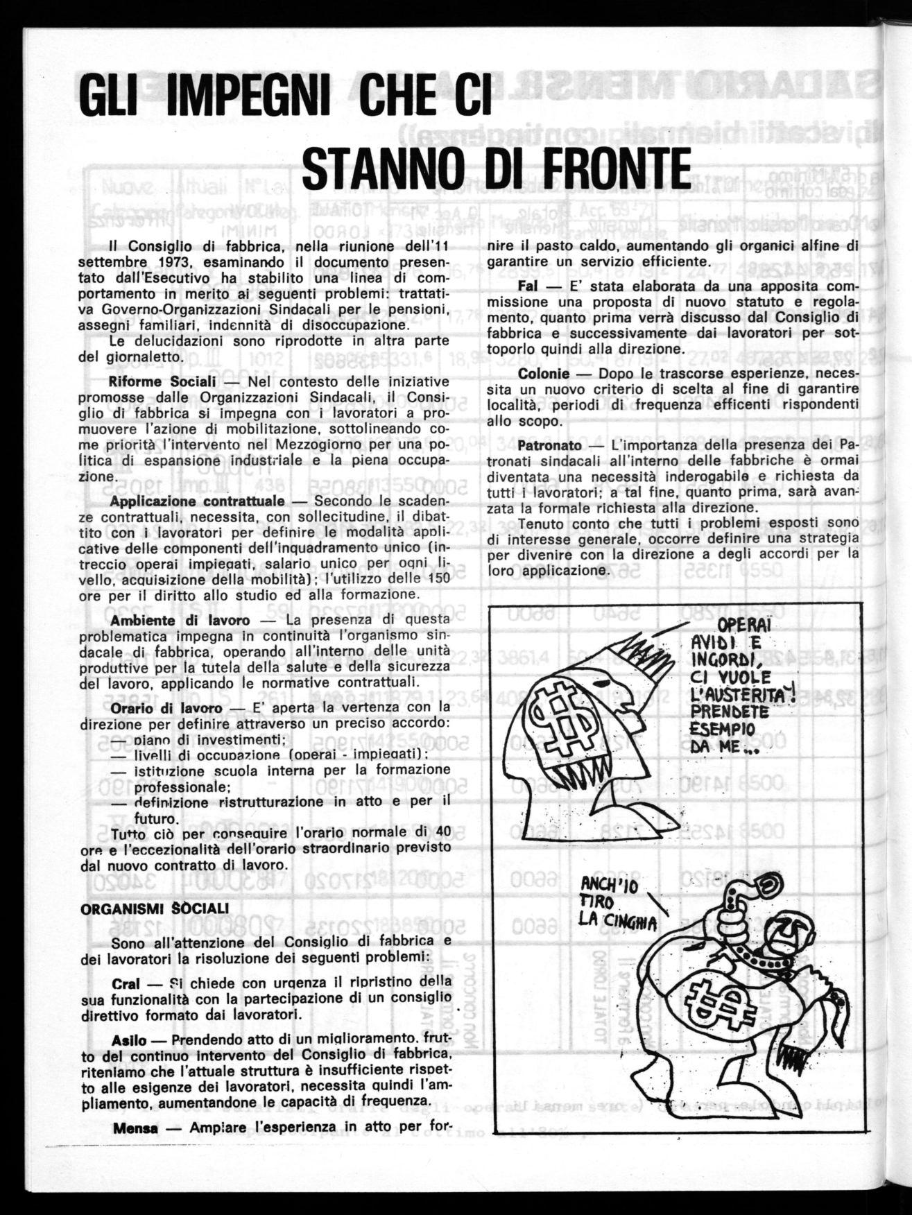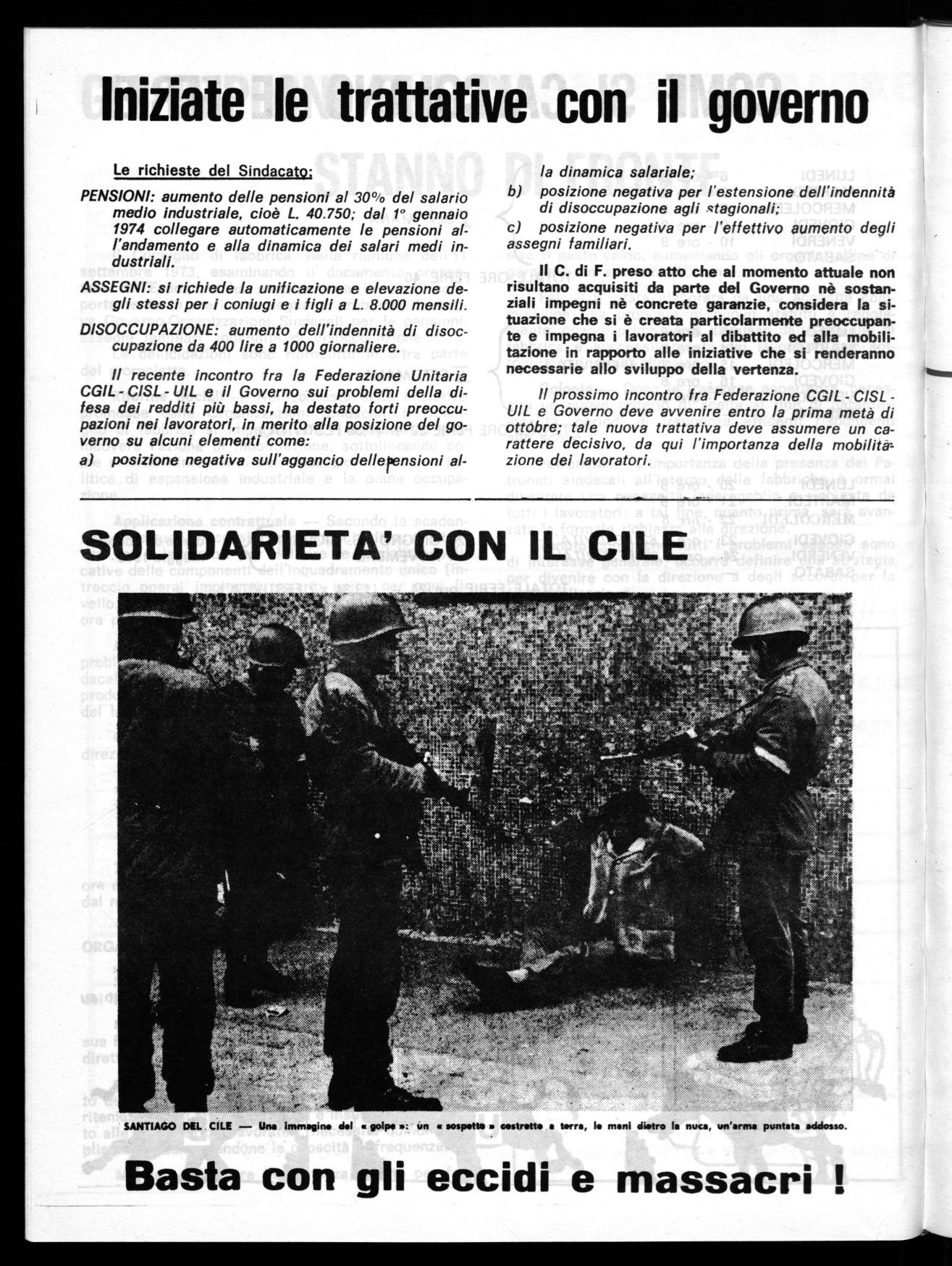 Il Consiglio di fabbrica, nella riunione dell'H settembre 1973, esaminando il documento presentato dall'Esecutivo ha stabilito una linea di comportamento in merito ai seguenti problemi: trattativa Governo-Organizzazioni Sindacali per le pensioni, assegni familiari, indennità di disoccupazione.