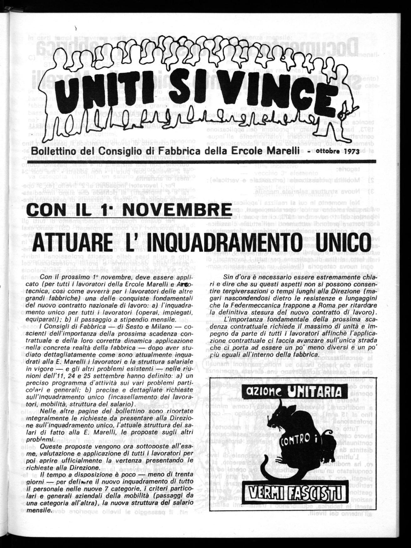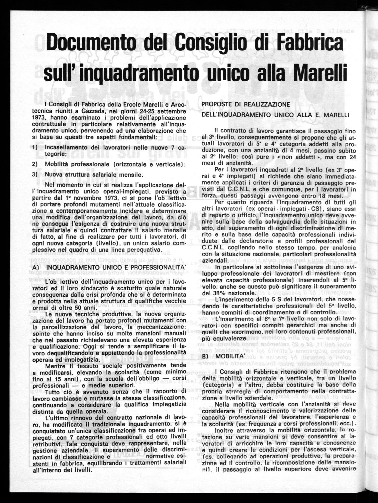 I Consigli di Fabbrica della Ercole Marelli e Areotecnica riuniti a Gazzada, nei giorni 24-25 settembre 1973, hanno esaminato i problemi dell'applicazione contrattuale in particolare relativamente all'inquadramento unico, pervenendo ad una elaborazione che si basa su questi tre aspetti fondamentali: