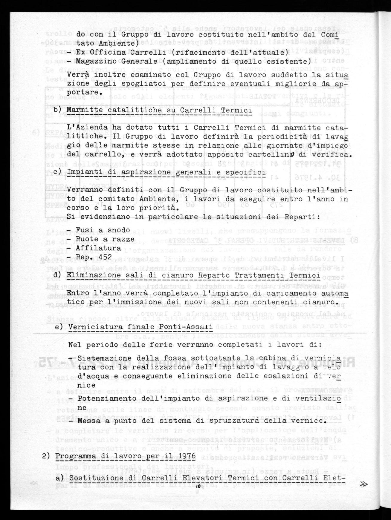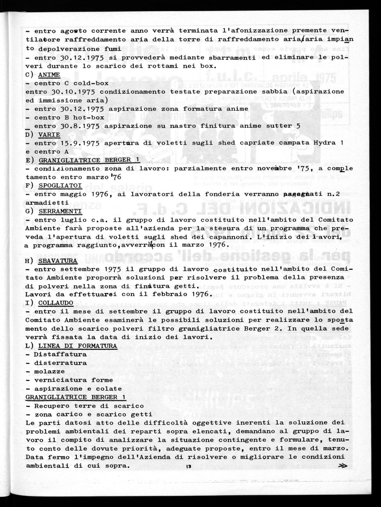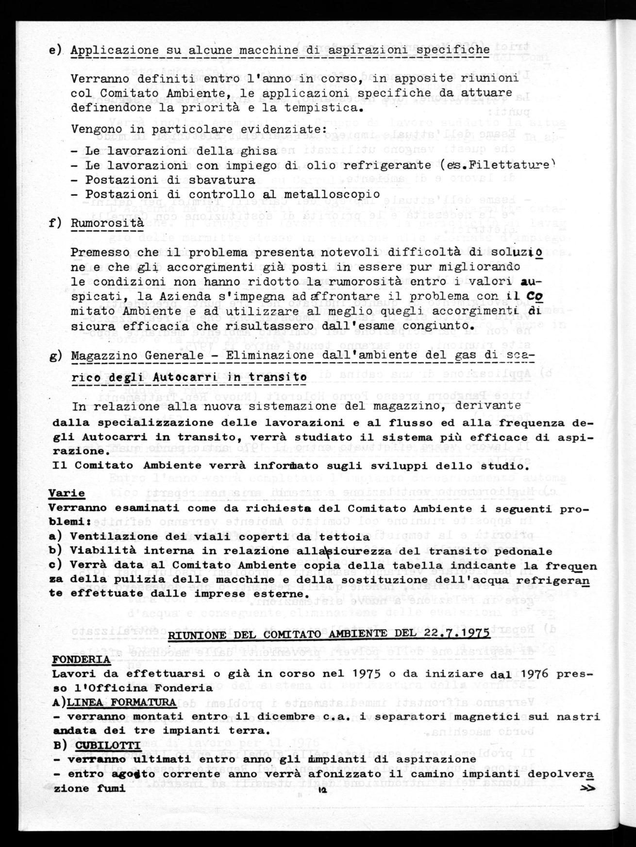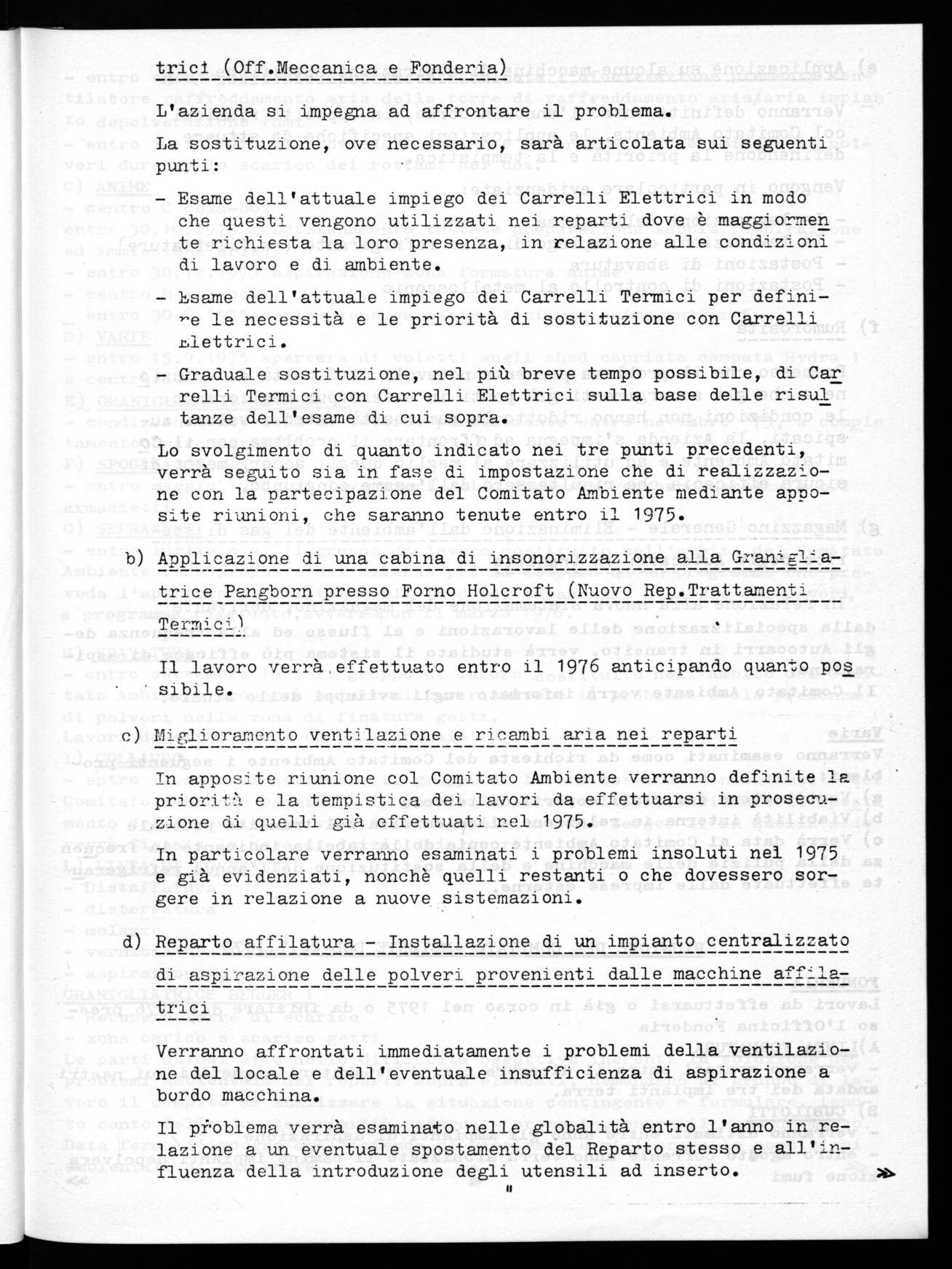 entro settembre 1975 il gruppo di lavoro costituito nell'ambito del Comitato Ambiente proporrà soluzioni per risolvere il problema della presenza di polveri nella zona di finitura getti. Lavori da effettuarci con il febbraio 1976.