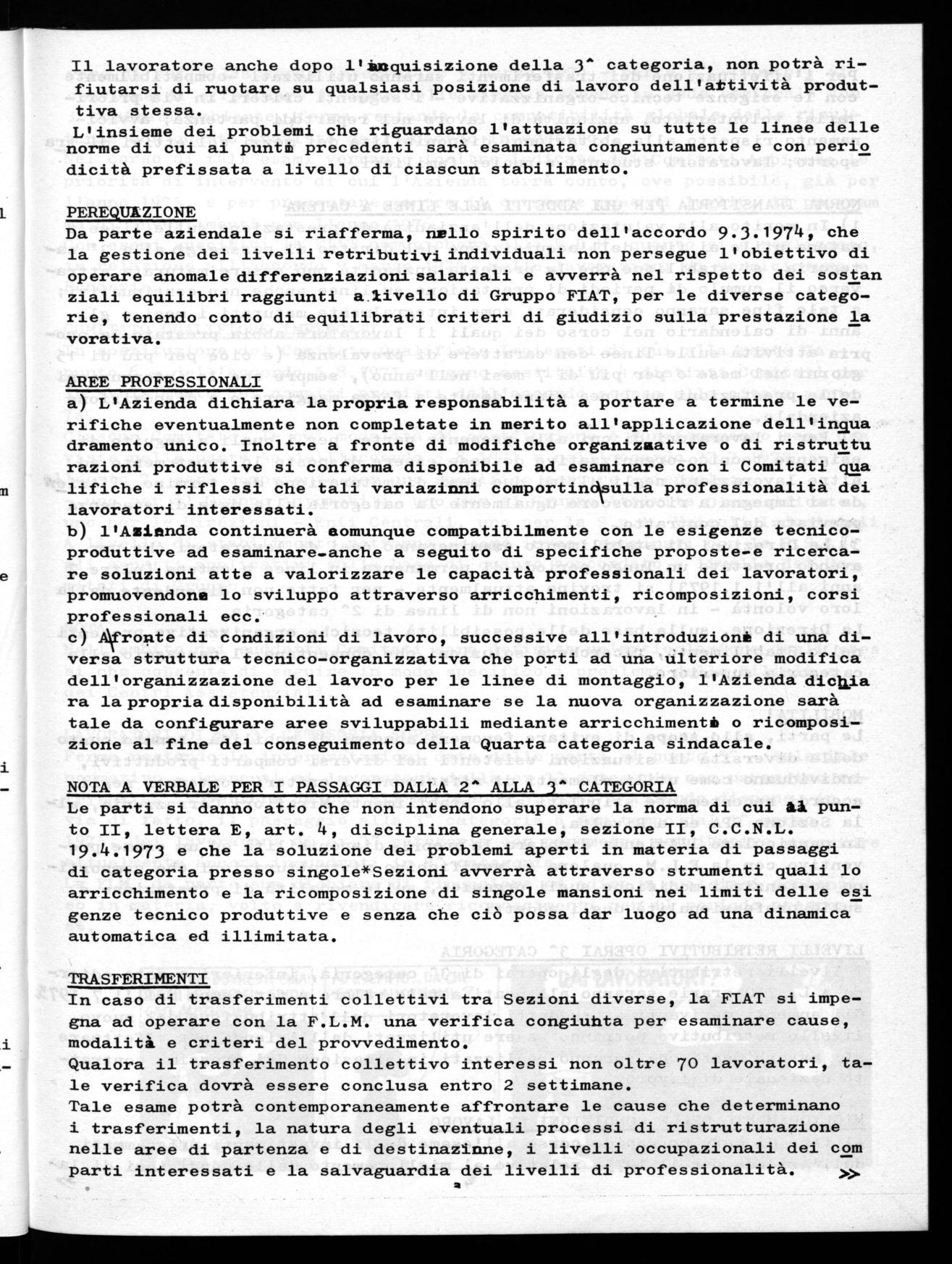 Nel quadro delle iniziative concordate nel settore dell'organizzazione del lavoro ed al fine di favorire una effettiva crescita professionale dei lavoratori, l'Aziendàsi dichiara disponibile ad attuare, nel settore delle linee di montaggio, una istruzione programmata che mediante la rotazione su più postazioni di lavoro permetta l'acquisizione della 3" categoria in tempi ridotti rispetto a quelli previsti dal C.C.N.L. .