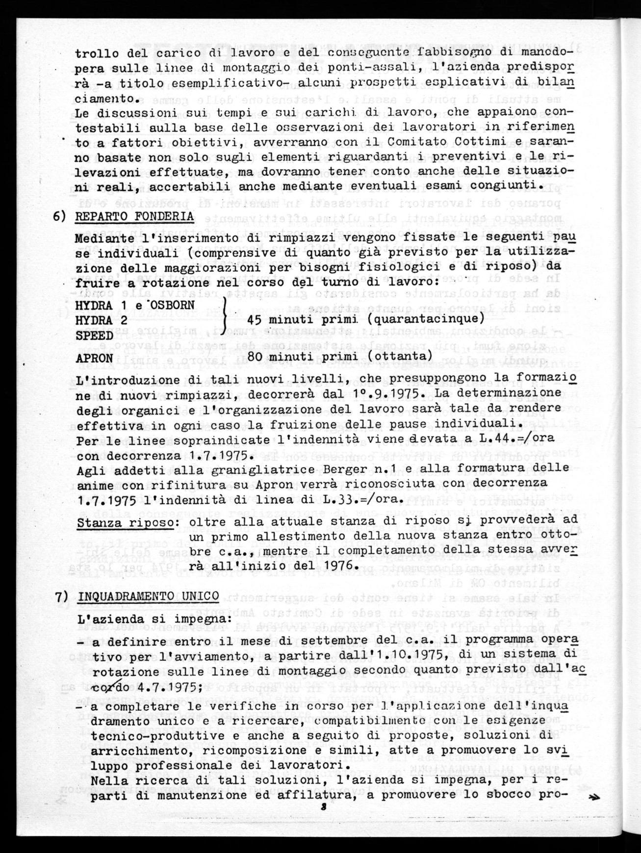 Agli addetti alla granigliatrice Berger n.1 e alla formatura delle anime con rifinitura su Apron verrà riconosciuta con decorrenza 1.7.1975 l'indennità di linea di L.33.=/ora.