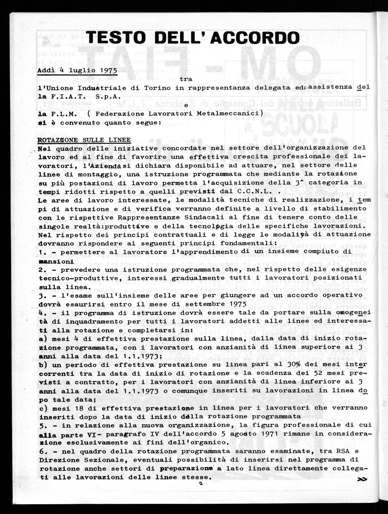 Il primo è l'accordo generale tra la FIAT e la FLM siglato a Torino e che riguarda tutto il gruppo.