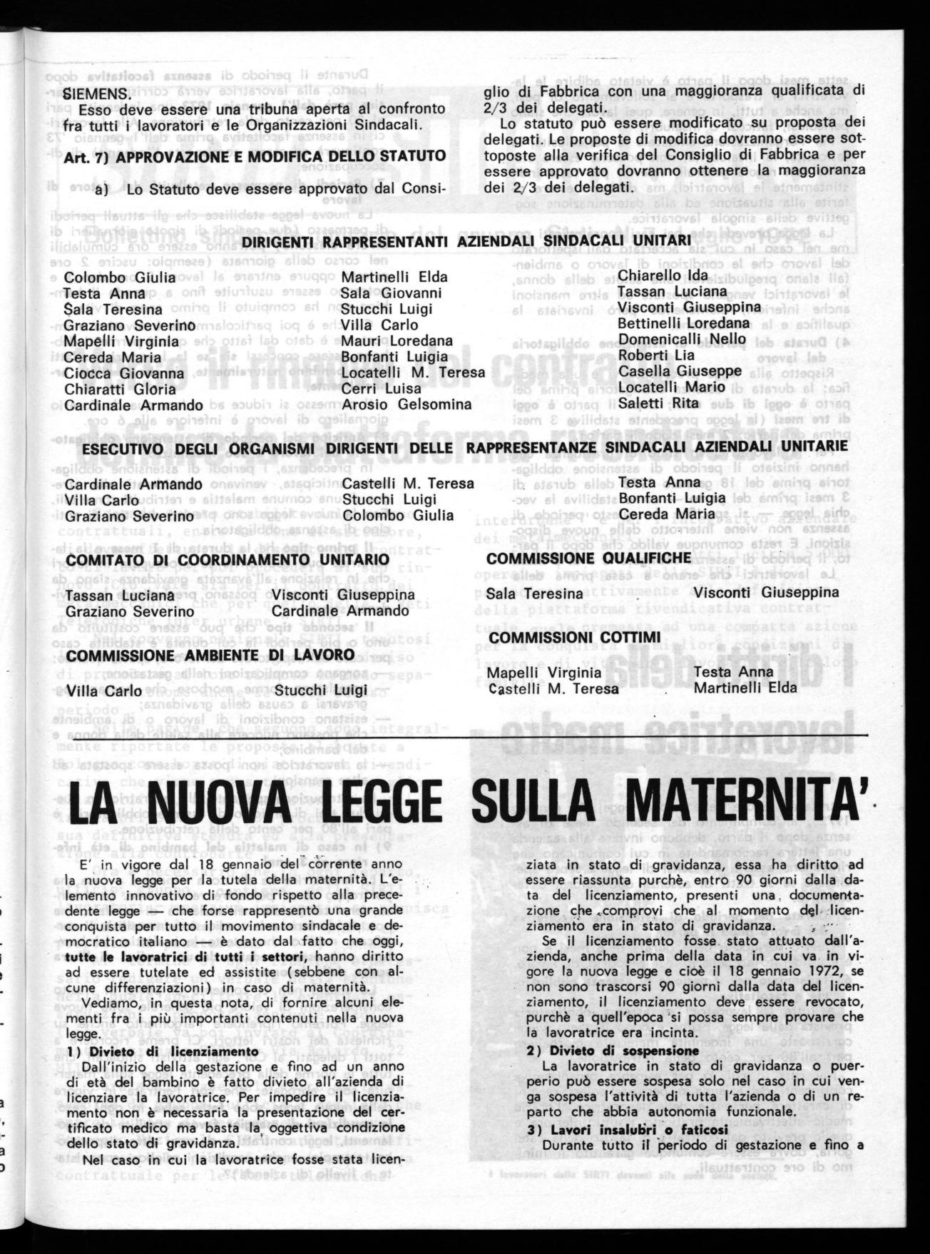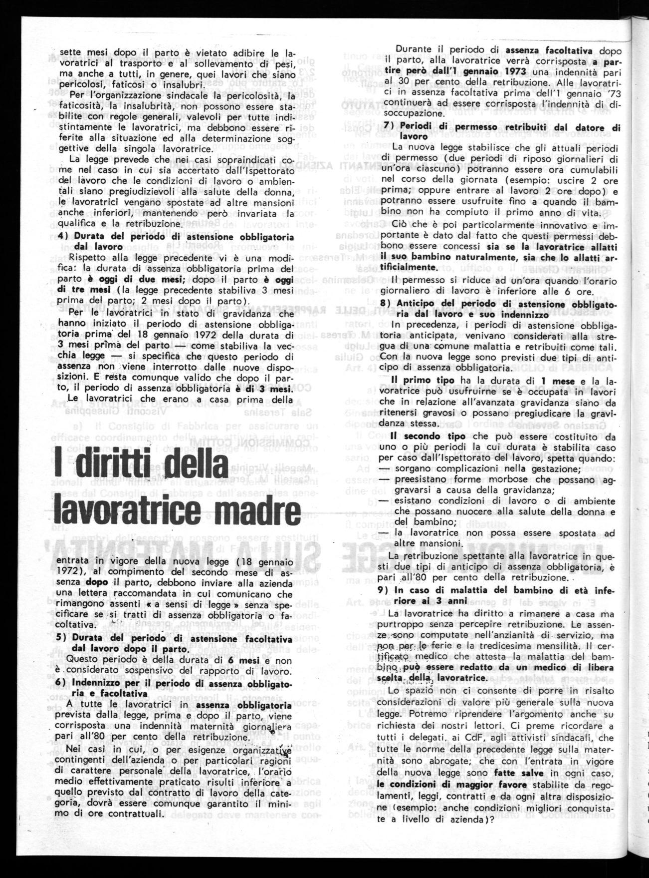 Lo spazio' non ci consente di porre in risalto considerazioni di valore più generale sulla nuova legge. Potremo riprendere l'argomento anche su richiesta dei nostri lettori. Ci preme ricordare a tutti i delegati, aì CdF, agli attivisti sindacali, che tutte le norme della precedente legge sulla maternità sono abrogate; che con l'entrata in vigore della nuova legge sono fatte salve in ogni caso, le condizioni di maggior favore stabilite da regolamenti, leggi, contratti e da ogni altra disposizione (esempio: anche condizioni migliori conquistate a livello di azienda)?