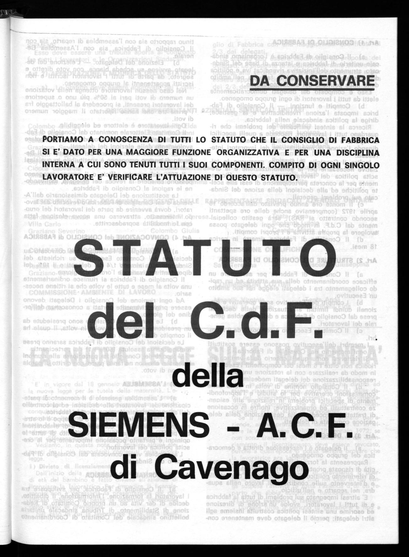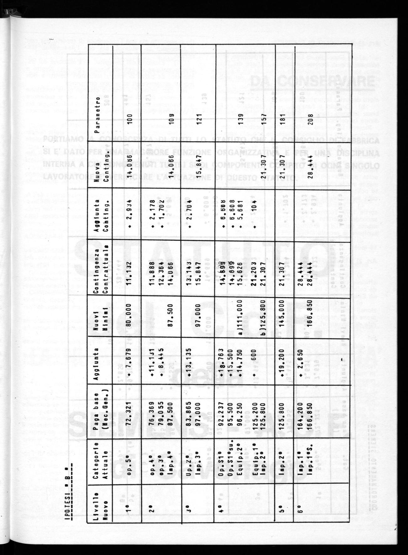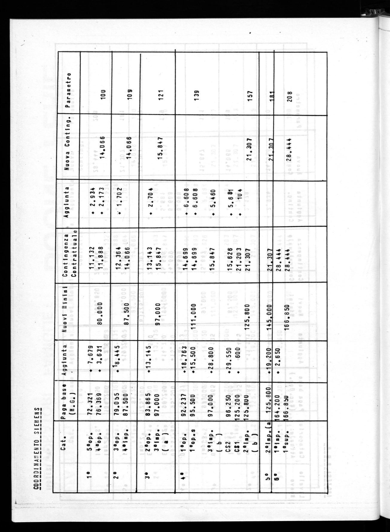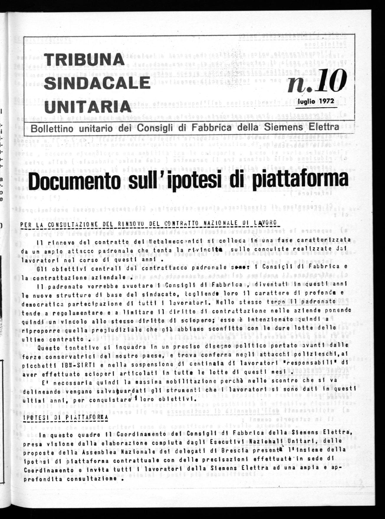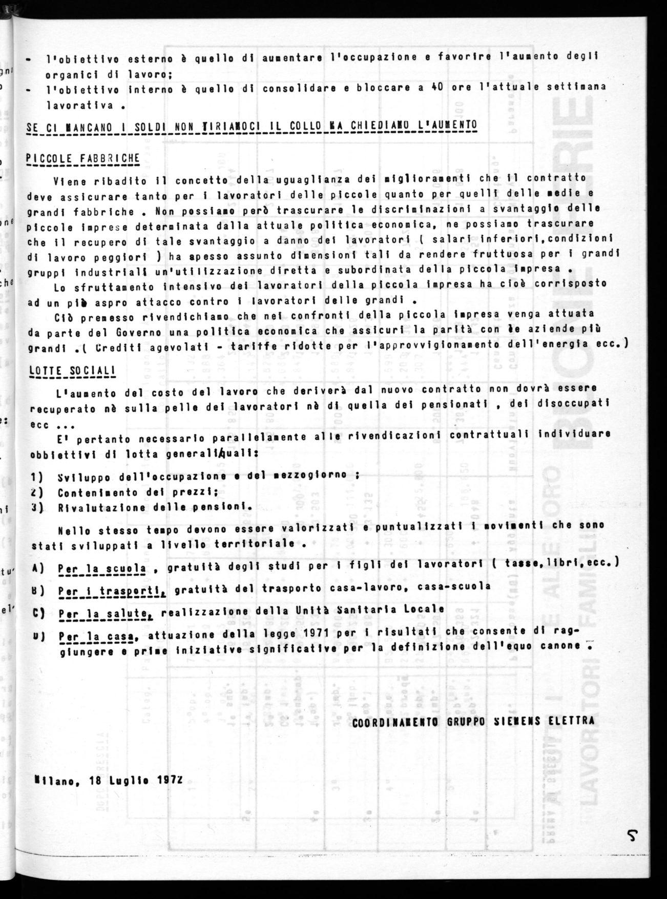 In questo quadro il Coordinamento dei Consigli di Fabbrica della Siemens Elettra, presa visione dalla elaborazione compiuta dagli Esecutivi Naziohali Unitari, delle proposte della Assemblea Nazionale dei delegati di Brescia presenta l'insieme della ipotesi di piattaforma contrattuale con delle precisazioni effettuaté in sede di Coordinamento e invita tutti i lavoratori della Siemens Elettra ad una ampia e approfondita consultazione .