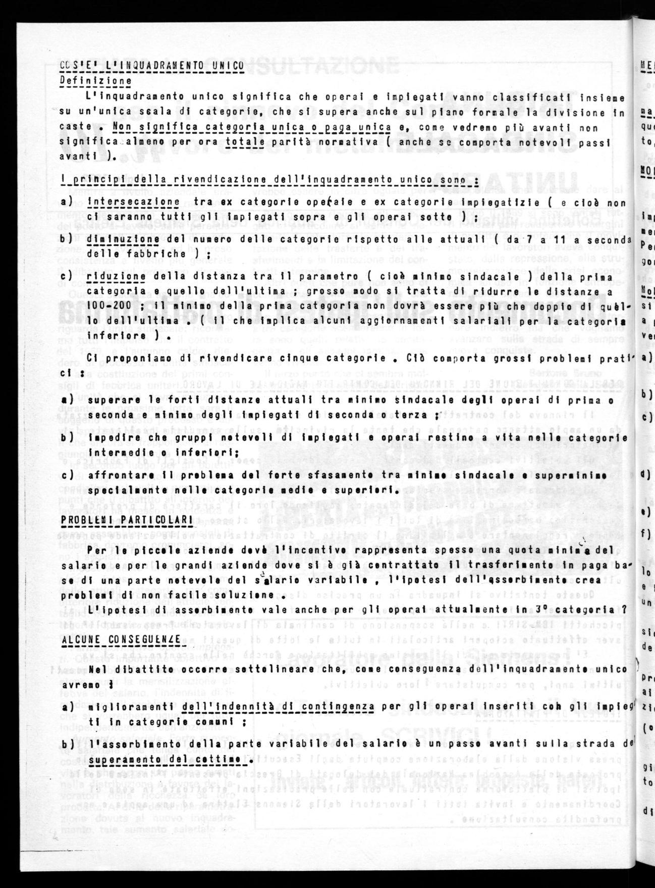 ALCUNE CONSEGUENZE Sii de Nel dibattito occorre sottolineare che, come conseguenza dell'inquadramento unico avremo ai miglioramenti dell'indennità di contingenza per gli operai inseriti coh gli impleg' zi, ti in categorie comuni ;