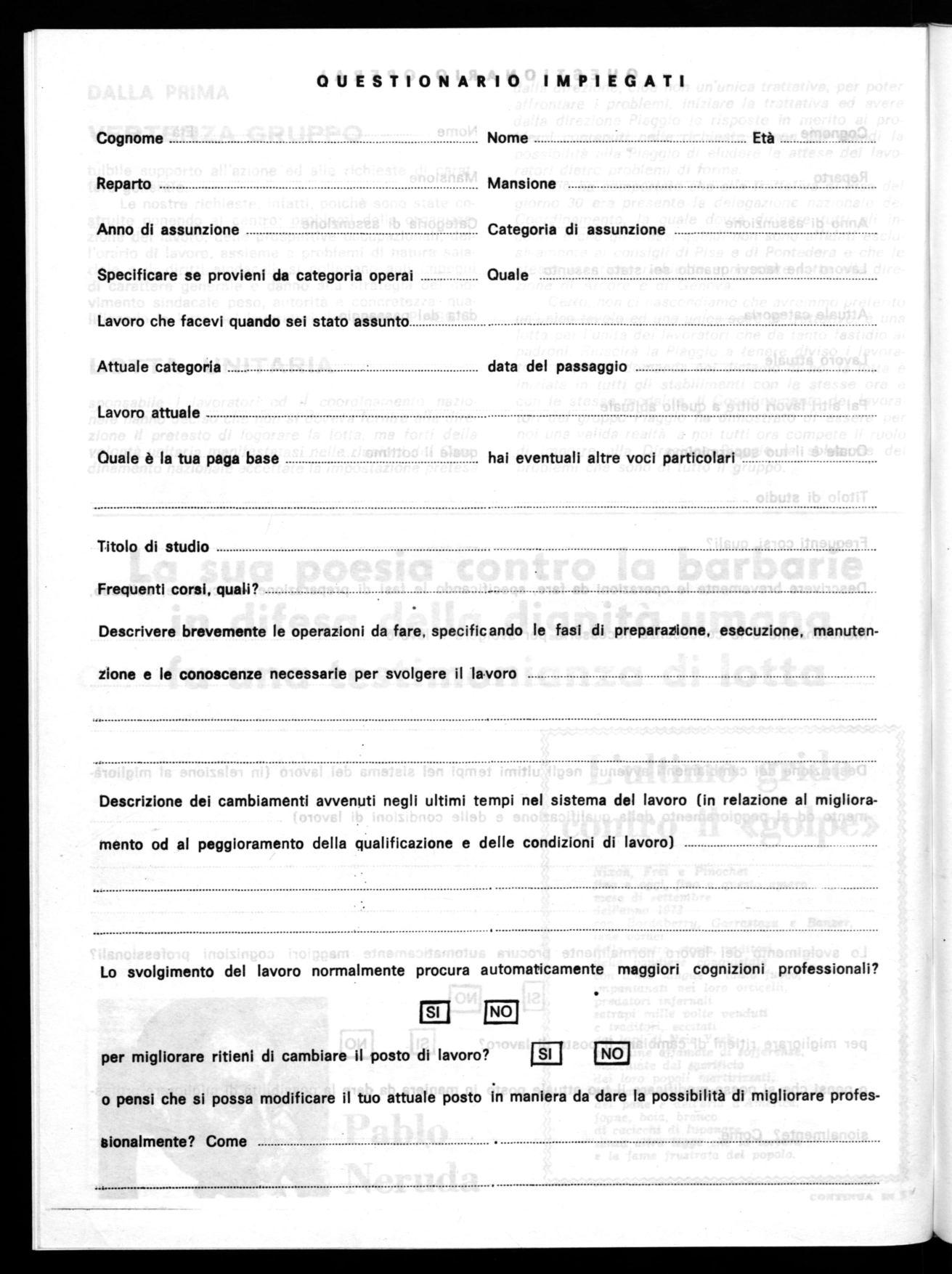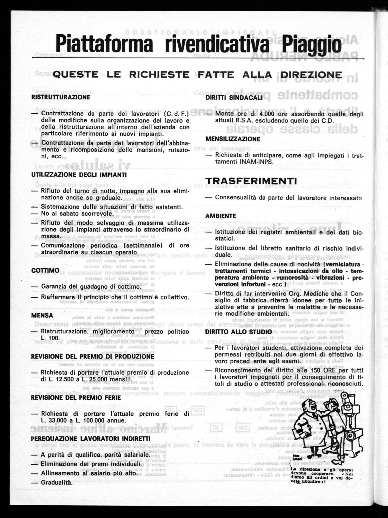 Le nostre richieste, infatti, poichè sono state costruite ponendo al centro: problemi della organizzazione del lavoro, delle prospettive occupazionali, dell'orario di lavoro, assieme a problemi di natura salariale e di diritti sindacali, si collegano agli impegni di carattere generale e danno alla strategia del movimento sindacale peso, autorità e concretezza, qualificando la lotta dei lavoratori del gruppo PIAGGIO.