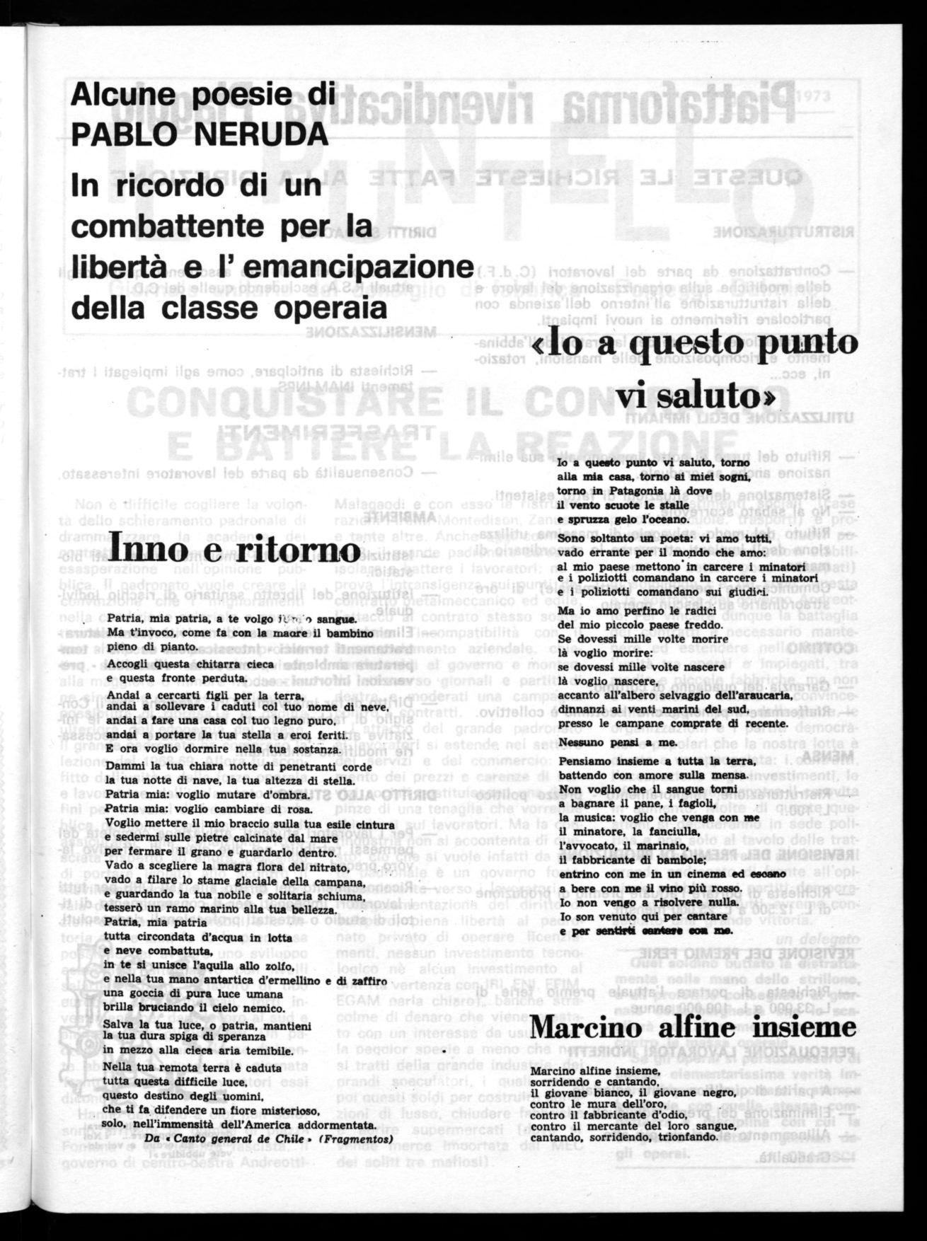 Nella lotta che attualmente stiamo conducendo, è contenuta l'esigenza del movimento sindacale di saper collegare in maniera sempre più stretta e conseguente le lotte aziendali alle lotte di carattere generali, in una prospettiva capace di mutare gli indirizzi antipopolari che hanno caratterizzato il modo di svilupparsi della nostra società.