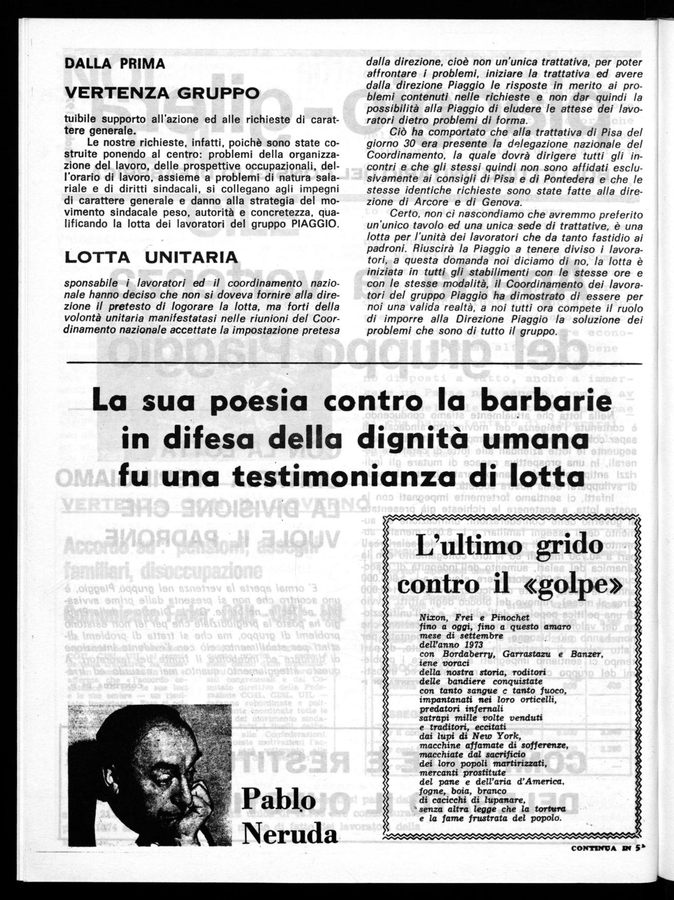 E' ormai aperta la vertenza nel gruppo Piaggio, è uno scontro che non si presenta dalle prime avvisaglie, nè facile, nè breve. Già la Direzione della Piaggio ha posto la pregiudiziale che per lei non esistonò problemi di gruppo, ma che si tratta di problemi distinti per stabilimento, ciò con l'evidente intenzione di dividere ed indebolire il fronte dei lavoratori. A questo atteggiamento quanto mai assurdo ed irreCONTINUA U( P